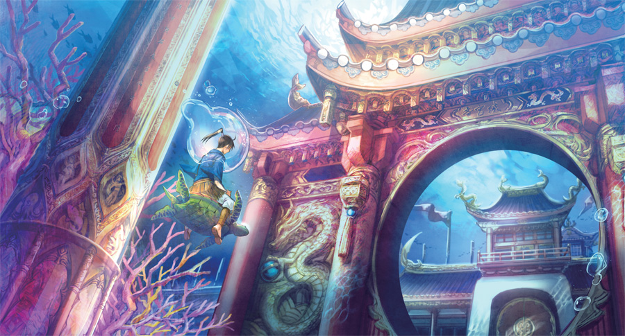 C’est l’univers de l’illustrateur qui va se révéler déterminant dans le choix du conte : « Le style de Fuzichoco (ampleur des décors, des détails, des lumières…) collait parfaitement pour illustrer le royaume sous la mer. » nous détaille Pierre-Alain Dufour, co-fondateur. nobi nobi propose alors à la Luciole de se replonger ensemble dans l’écriture « en se basant sur un texte encore plus ancien, plus juste par rapport à la culture japonaise » nous explique t-elle.