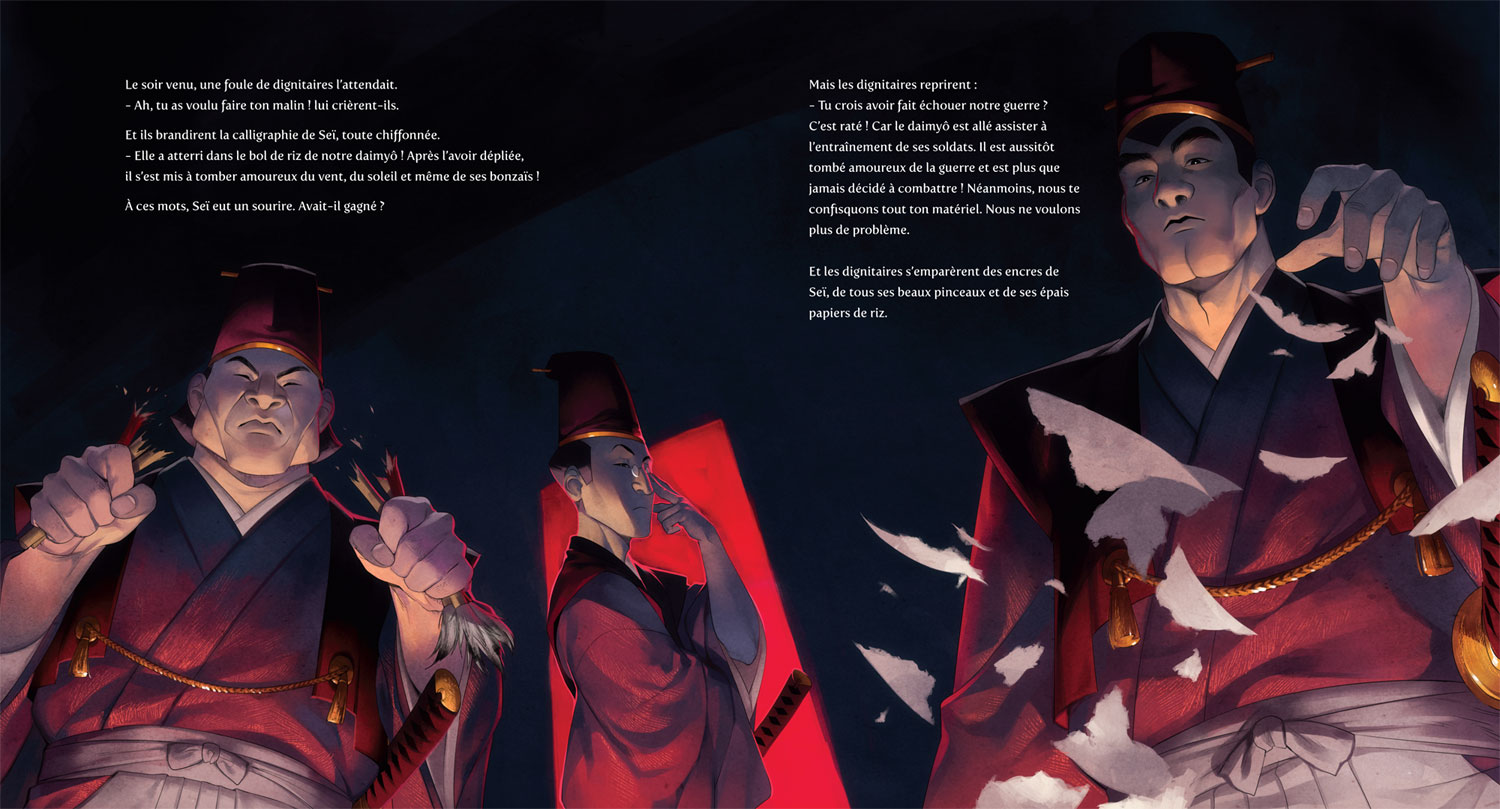 L’oeuvre a donc eu de nombreuses occasions d’être enterrée. Mais il semble que tout arrive pour une bonne raison… Lorsque nous demandons à Audrey son illustration favorite, elle nous avoue d’abord ne pas s’être posée la question, et elle se met à feuilleter l’ouvrage. Elle apprécie la double page avec les poissons, qui ressemble beaucoup à l’idée qu’elle s’en faisait, puis elle s’arrête net sur la double page où les hommes du daimyô déchirent les calligraphies de Sei : « en fait, parmi les nombreuses coïncidences de ce livre, j’ai découvert cette page à l’époque des événements de Charlie Hebdo et je me suis dit que cette histoire d’un petit garçon dont on détruit l’art pour l’empêcher de s’exprimer était complètement en rapport avec l’actualité. Je l’aime beaucoup car elle est violente mais aussi élégante à la fois. »