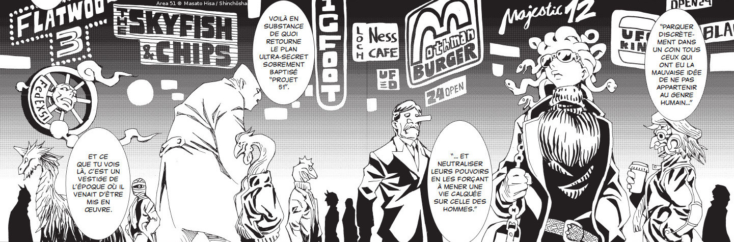 Area 51 de son côté prend la voie des mythes et légendes en allant piocher allègrement dans toutes les cultures du monde, passées ou présentes. Pèle mêle, on y croisera aussi bien créatures issues de différentes mythologies ou folklores, divinités d’à peu près tous les panthéons, personnages de légendes, yokai, vampires et autres monstres sacrés de la littérature… Voire même un peu de cryptozoologie, de légendes urbaines ou, zone 51 oblige, de science fiction. Le tout étant généralement détourné et arrangé à la sauce de l’auteur. Ce joyeux fatras cohabite alors dans une ville qui prend des airs totalement surréalistes où le fantastique est la norme, sans pour autant délaisser complètement la réalité du monde extérieur.