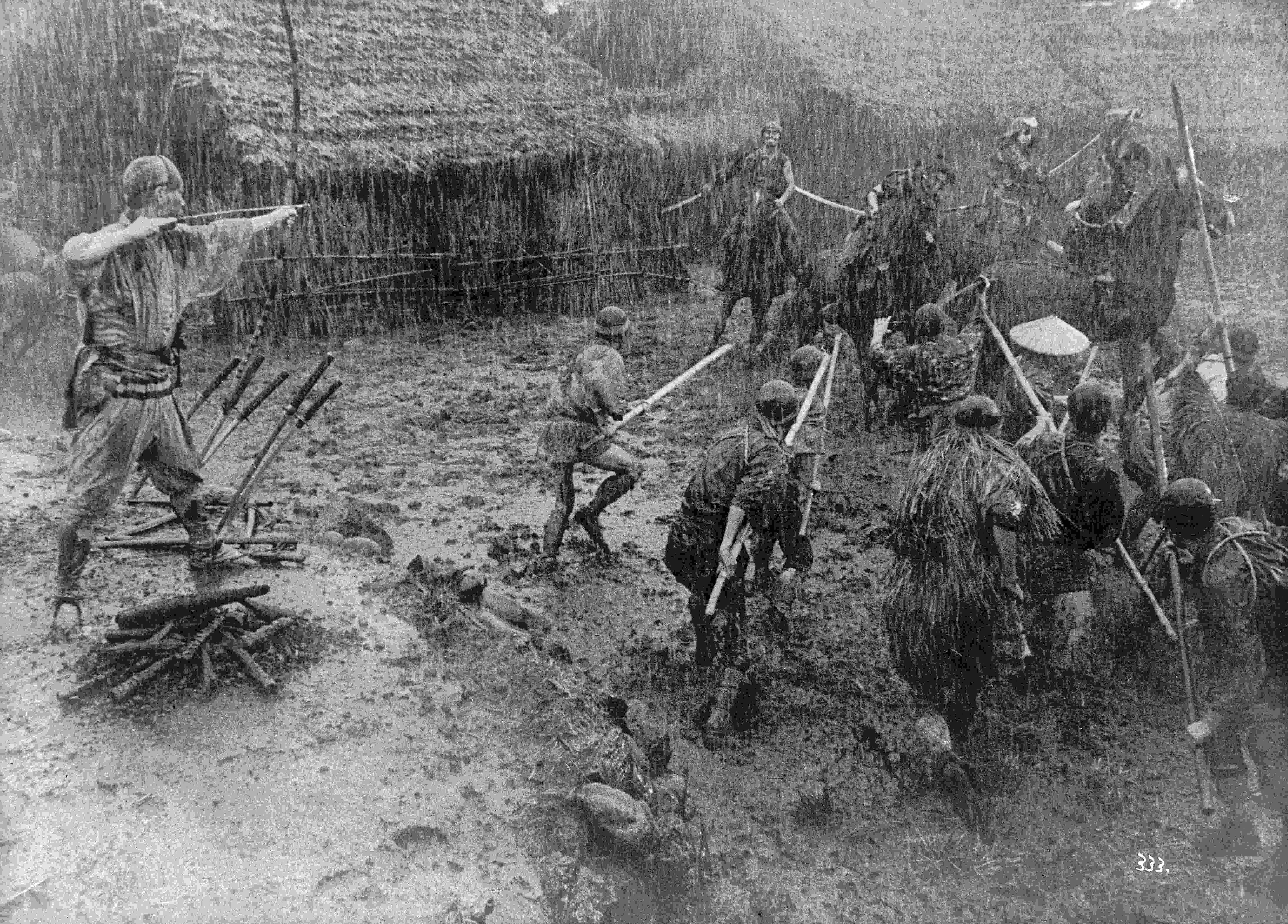 Le film expérimente aussi la mise en image de l’action. L’équipe disposera 3 caméras pour couvrir simultanément plusieurs scènes et faciliter le montage. Lorsque les villageois croient à une attaque des brigands, ce dernier s’articule sur une succession de plusieurs travellings, présentant un à un chaque protagoniste. Les travellings latéraux et les panoramiques permettent plus de fluidité. KUROSAWA combine plusieurs types de cadres grâce à ces deux valeurs de plans. L’utilisation de l’accéléré permet de donner plus d’intensité à la scène, alors que le ralenti la dramatise à outrance. Si le cinéaste s’attarde longuement sur la traversée du village par Kanbei, c’est pour que nôtre regard ne soit pas perdu spatialement lors des différents assauts. Une approche stratégique qui fait écho à l’intelligence des personnages sur la menace et la mise en scène les iconise, au cœur de l’action. Le ton solennel de certaines scènes ne vire jamais au pompeux. La bataille finale sous la pluie permet à KUROSAWA de faire des samouraïs de véritables mythes vivants, ayant aidé une communauté à retrouver foi en elle. Les faiblesses des personnages accentue paradoxalement leur héroïsme, et l’identification que le spectateur éprouve à leur égard. La dernière réplique de Kanbei conclue le récit sur une note libre d’interprétation.