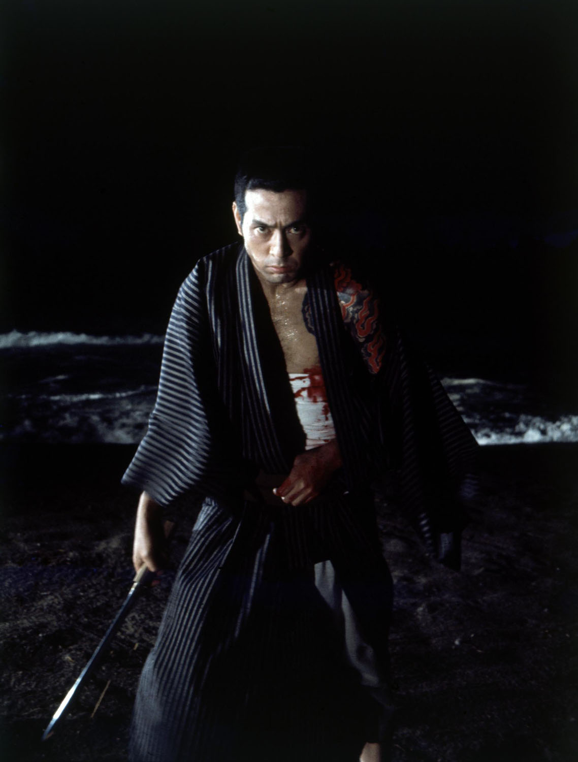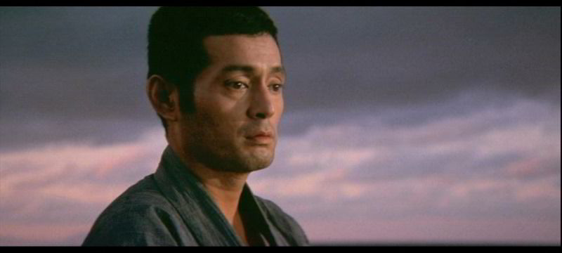 C’est particulièrement le cas dans la dernière partie, où NAKADAI cède enfin à l’appel de la violence et abat son courroux sur ses anciens frères d’arme alors que la fête bat son plein au dehors. Le temps d’un plan sur un musicien dont le shamisen rythme la matsuri, Iwahashi et son adversaire débouchent à l’arrière-plan en pleine étreinte mortelle. Ainsi, Iwahashi/NAKADAI, après avoir passé la majeure partie du métrage en position de déférence, faisant tout pour éviter de se battre (GOSHA le compare littéralement à un petit chiot qu’il recueille à sa sortie de prison), se transforme en une figure vengeresse mise en parallèle avec les vagues déchainées et les guerriers menaçants qui ornent les murs de la salle de réception où débute le combat (il a lui-même un démon protecteur tatoué sur le dos).