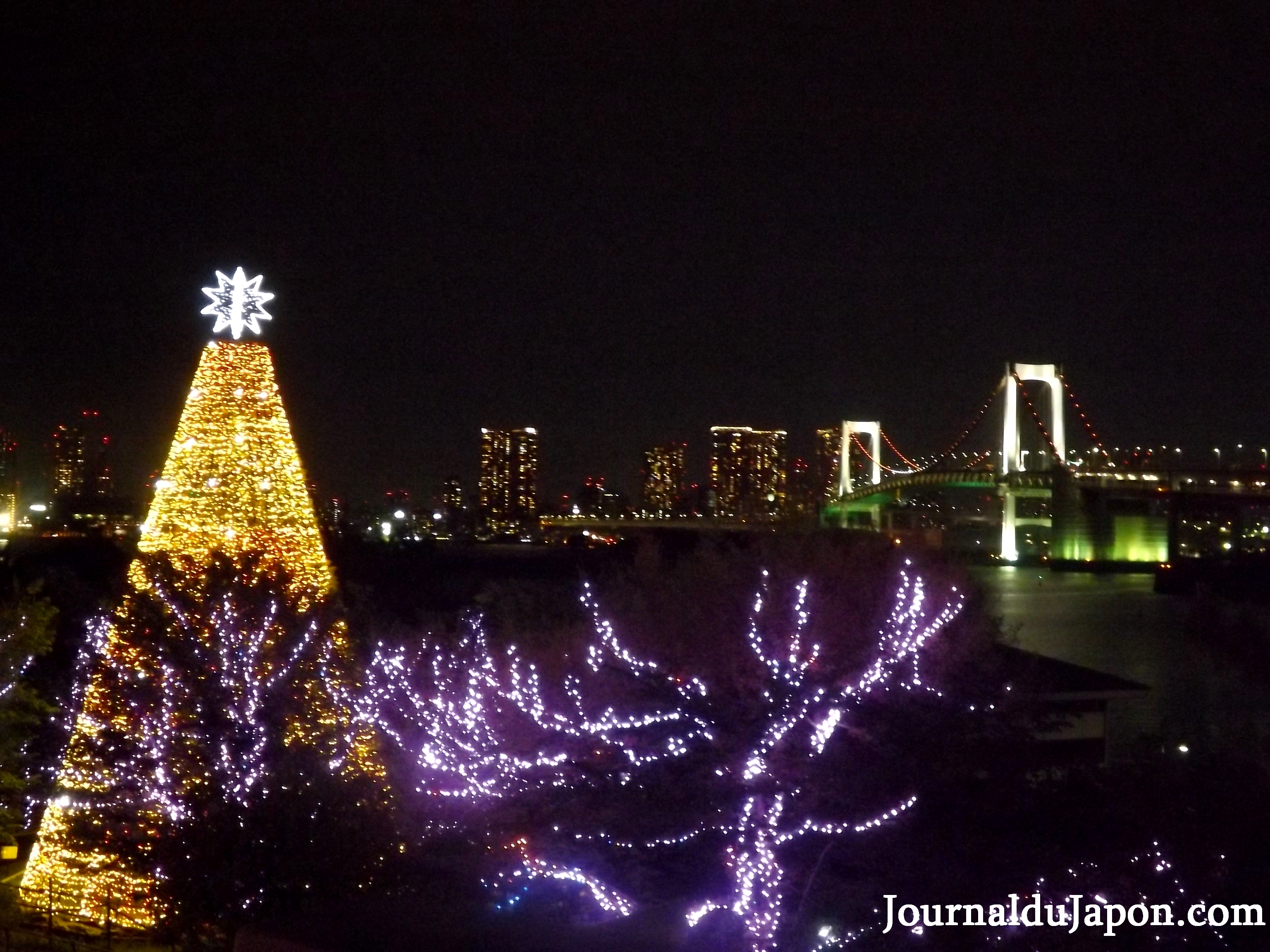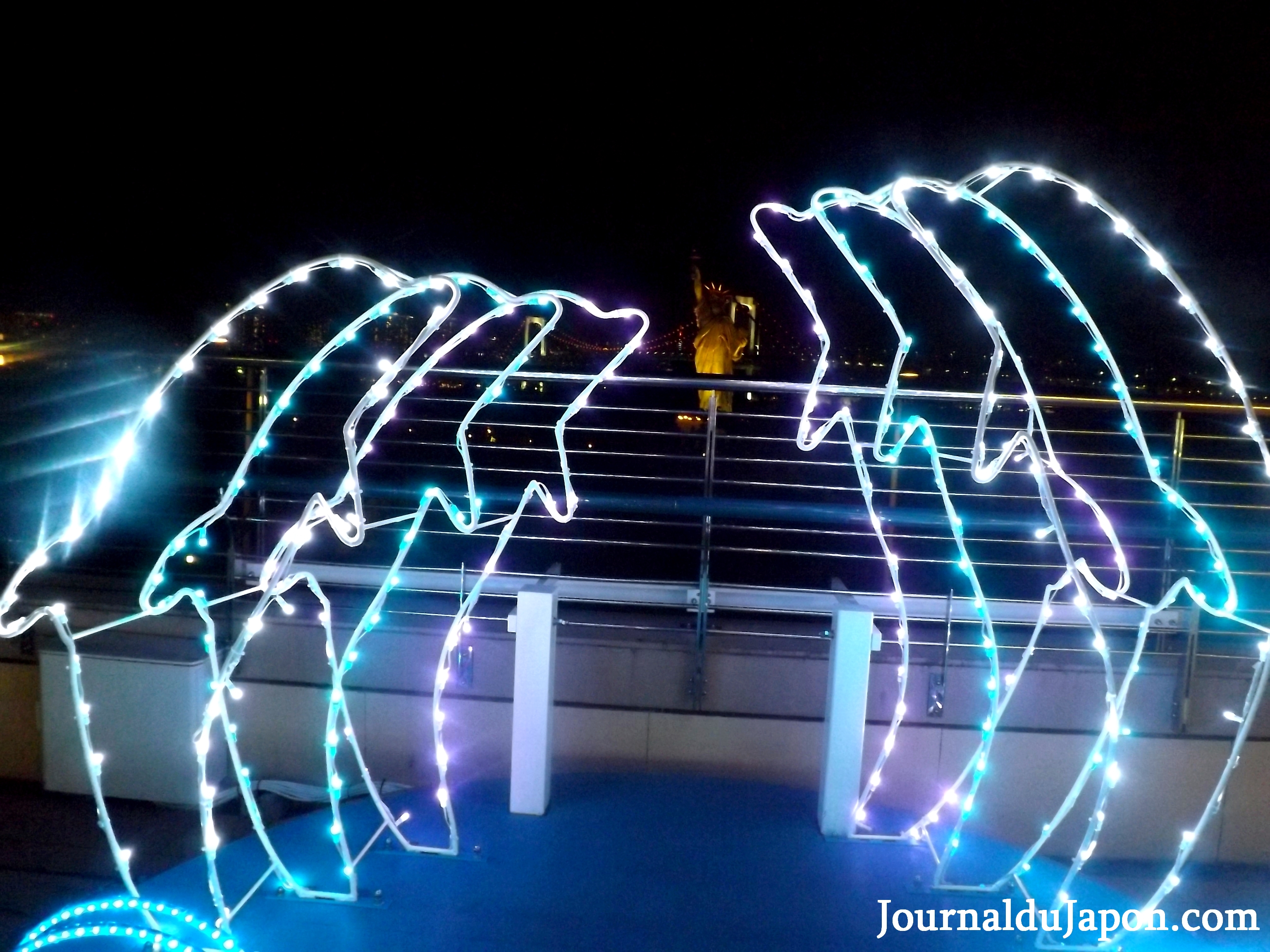 La nuit tombée, l’île s’illumine et offre un nouveau spectacle saisissant. Les couleurs viennent habiller la grande roue, les buildings, les escaliers, les jardins… Mais c’est surtout du côté de la baie que le panorama se montre le plus enchanteur. Dans le même champ de vision, une réplique de la Statue de la Liberté (en plus petite bien entendu), le Rainbow Bridge tout en couleur, et la mer scintillant à la lumière des immeubles gigantesques luisant au loin. On se croirait dans un rêve. Se promener dans cette partie d’Odaiba la nuit est une expérience dont vous vous souviendrez pendant longtemps.