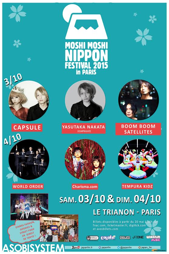 – Le Festival Moshi Moshi Nippon 2015 aura lieu les 3 et 4 octobre au Trianon de Paris. Les billets sont déjà en vente aux prix de 39,50 euros (Billet journée) mais aussi 72,50 euros (Pass 2 jours).