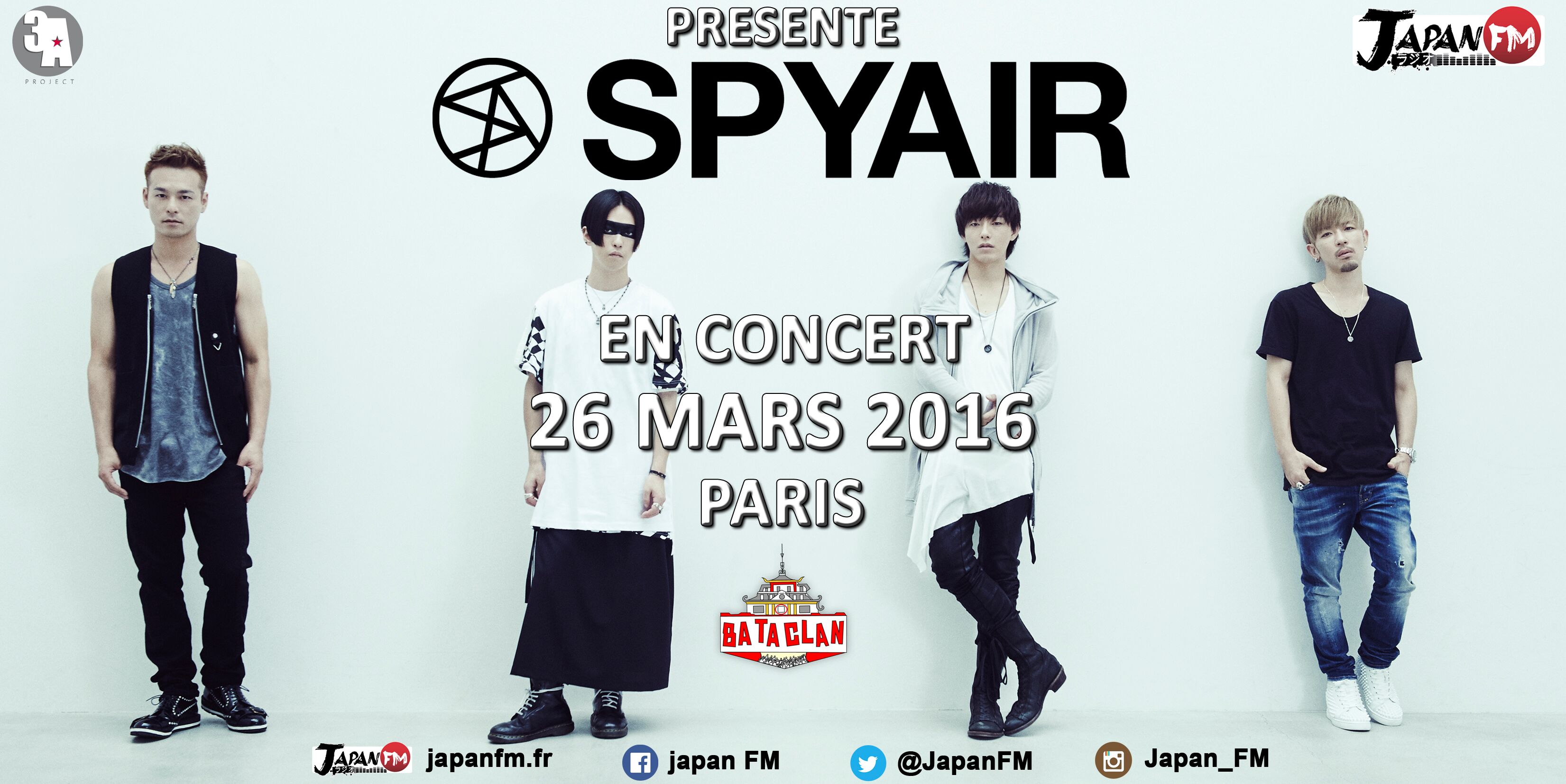 – Le groupe SPYAIR est de retour en France avec cette fois un concert dans une vraie salle. Il sera organisé par la radio Japan FM et se déroulera le samedi 26 mars au Bataclan