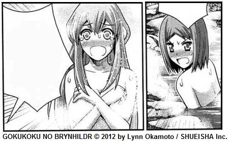 Dans beaucoup de shônens ou de seinens, les personnages féminins, surtout quand il s’agit de faire-valoir au héros (ou sidekicks), ont parfois une poitrine si opulente qu’elle en défie les lois anatomiques, tout en s’avérant en parallèle curieusement très dénudée. Même si les auteurs pourraient s’en défendre en parlant « d’atout charme » ajouté à leur histoire, on notera sans être dupe qu’il s’agit bien entendu de charmer ces messieurs (ci-contre, la pauvre Kotori dans Brynhildr in the darkness), et que ce fan-service ecchi a rarement un pendant masculin dans ces mêmes titres.