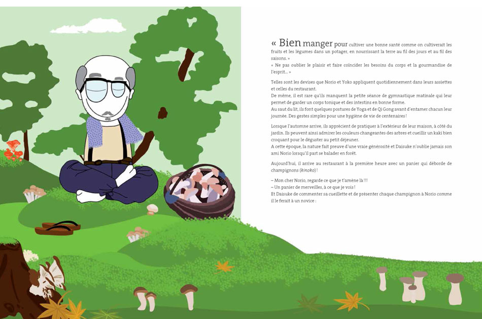 Au fil des pages, le lecteur découvre le jardin de Norio et Yoko, le marché, la forêt où poussent de délicieux champignons, il croise un vendeur de tofu, une critique gastronomique, le tout dans la joie et la bonne humeur.