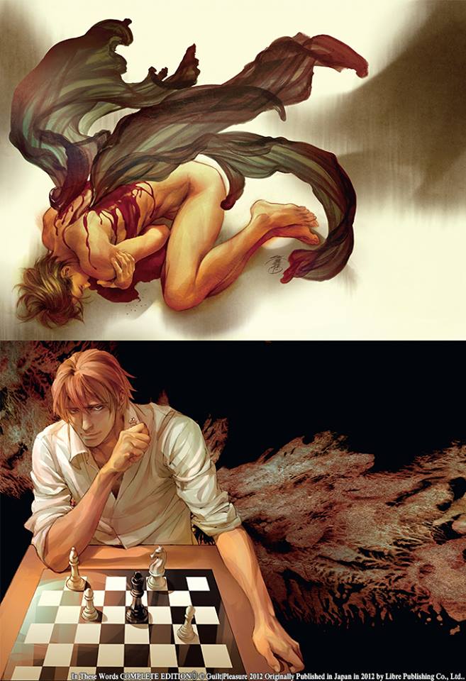 Mais avant, un petit rappel s’impose. Guilt|Pleasure est donc composé de Jun Togai (ou Jo Chen, de son nom d’illustrateur) au dessin et de Narcissus en tant que scénariste. Leur oeuvre principale In These Words est une histoire qui est parue d’abord sur internet, et qui forte de son succès paraît ensuite en version papier dans plusieurs recoins de la planète tels que la Corée ou la Chine. Le récit fait ses premiers pas chez nous grâce aux éditions Taifu qui nous la présente lors dès Japan Expo 2014 et sous une édition limitée. Aujourd’hui, les aventures du psychologue Katsuya et du tueur en série Shinohara n’en finissent plus de faire couler de l’encre, et la sortie du tome 2 ce 24 septembre tombe à point nommé pour en savoir plus sur ces auteurs…