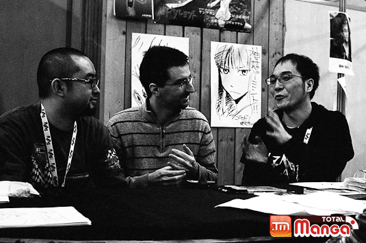 C’était Dai Sato (ci-contre, à droite, NDLR). Je me rappelle la première fois qu’il était là : il était avec nous assis sur des chaises à manger des crocodiles Haribo, une heure avant l’ouverture des portes et nous dit « euh on a pas le droit de fumer, non ? » et je lui dis « oh allez vas-y, t’inquiètes » et il était enchanté parce qu’il pouvait faire ce qu’il voulait. Il nous a demandé ensuite s’il pouvait se balader dans le salon et comme ce n’était pas encore ouvert on lui a dit « oui vas-y du moment que tu reviens pour l’ouverture et ta dédicace ce n’est pas un souci » … apparemment, ça ne se passe nulle part ailleurs ! Et après ils nous font une super pub « c’est génial, on est libre, on est super bien traités, ils nous imposent rien du tout… »