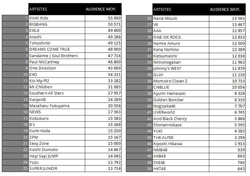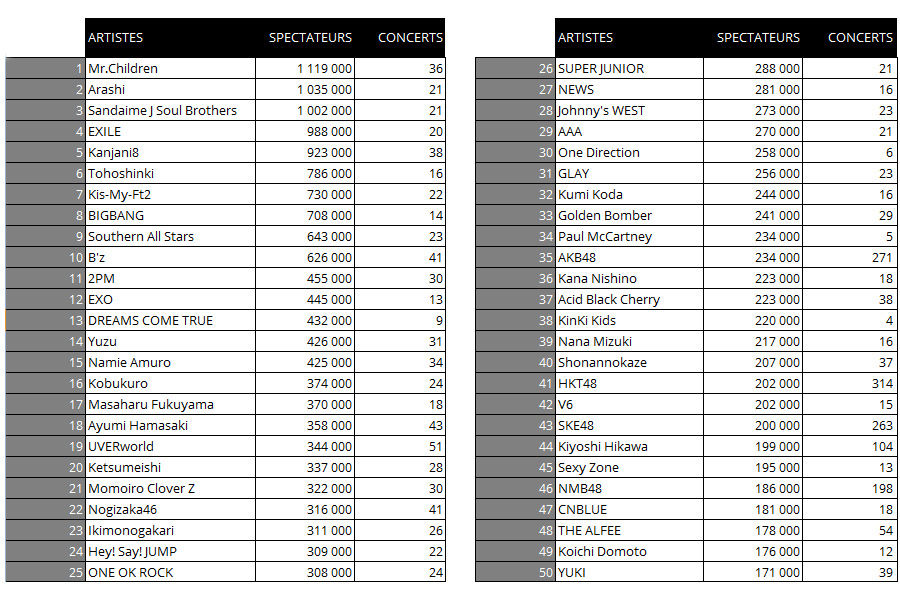 Les premières places ne sont guère très surprenantes, et reflètent assez bien les classements de popularité et ceux des ventes de disques dans l’archipel. L’indéboulonnable groupe de rock Mr.Children, au succès transgénérationnel, domine le top avec plus 1,19 millions de spectateurs accueillis lors de leurs concerts de l’année 2015. Derrière on retrouve toute une collection de boysbands de tous horizons, traditionnellement gros pourvoyeurs d’entrées grâce à une fanbase féminine très amatrice de live shows. Les trois principales écuries sont représentées : la Johnny’s Jimusho avec Arashi (2ème), Kanjani8 (5ème) ou encore Kis-My-Ft2 (7ème); EXILE (4ème) et ses sous-produits estampillés EXILE TRIBE comme Sandaime J Soul Brothers (3ème); et plus étonnamment toujours un bon nombre de groupes coréens comme les historiques Tohoshinki (6ème), BIGBANG (8ème), 2PM (11ème) et EXO (12ème). Tous dépassent ou s’approchent de peu de la barre des 500 000 spectateurs.