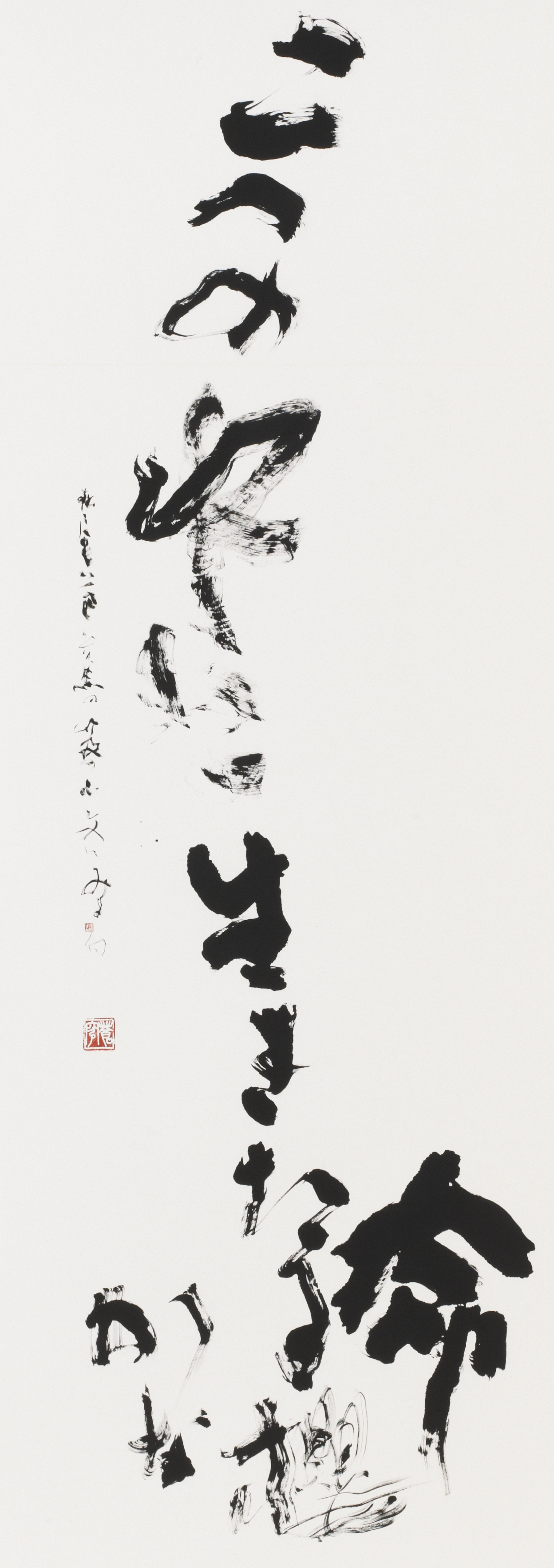 Ensuite, celle de Nagomori Sokyu (1950 – Poèmes modernes, Vers de Matsuo Basho) pour sa linéarité cette fois. Ses courbes donnent une impression de douceur, avec des caractères semblant danser. Elle dégage un sentiment de légèreté et de poésie qui tranche particulièrement avec la précédente.