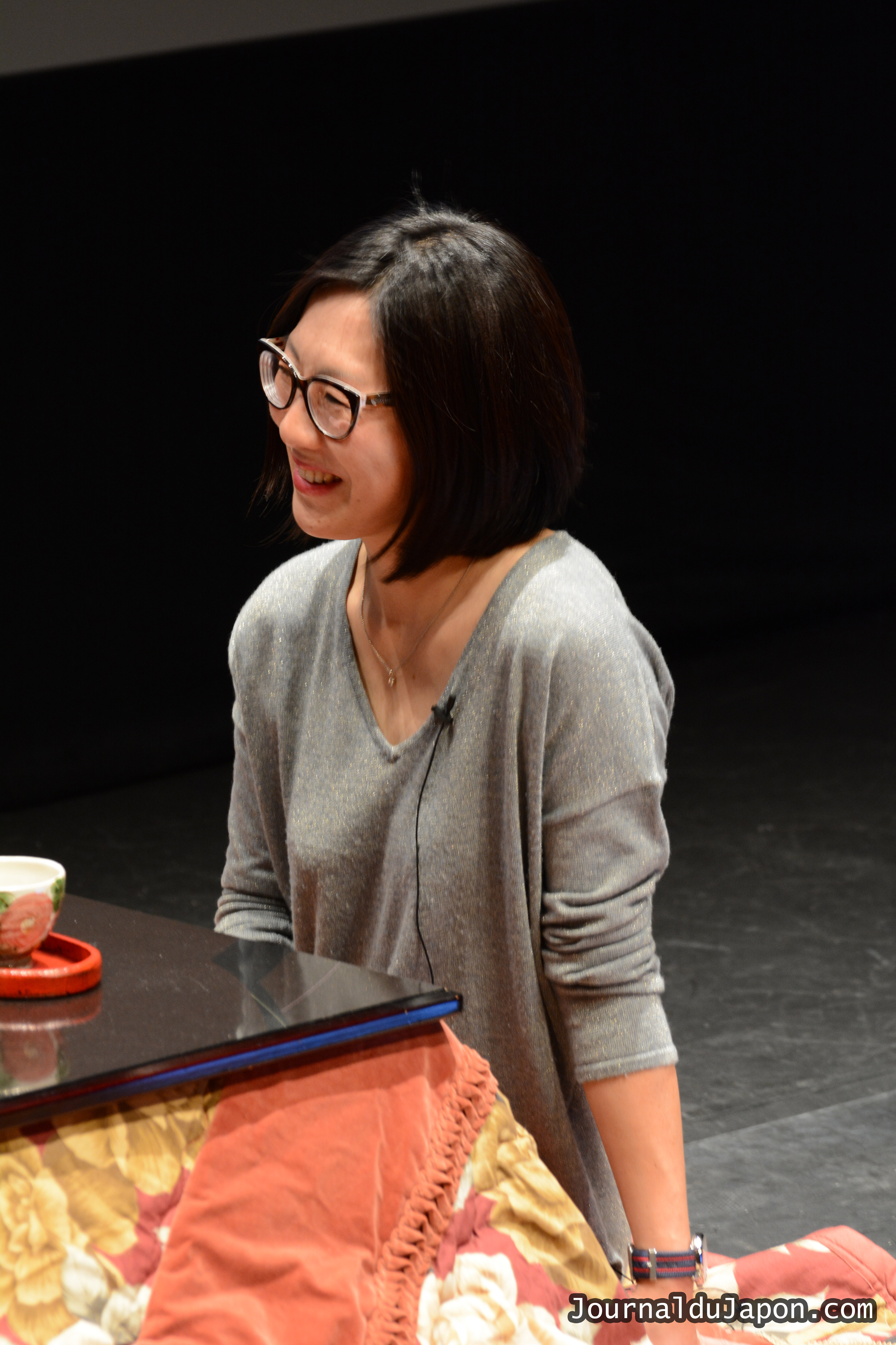 La conférence s’est déroulée autour d’un kotatsu (= table chauffante), avec du thé et des clémentines : un rapport assez intimiste pouvait alors s’installer entre les trois acteurs. La mangaka, sa traductrice et Patrick Honnoré échangeaient en toute simplicité, à l’image d’une après-midi hivernale où l’on discute de choses et d’autres. Cette atmosphère détendue était étayée de quelques images mettant en avant certains points importants de It’s your world, qui sont venus ponctuer le débat du début à la fin.
