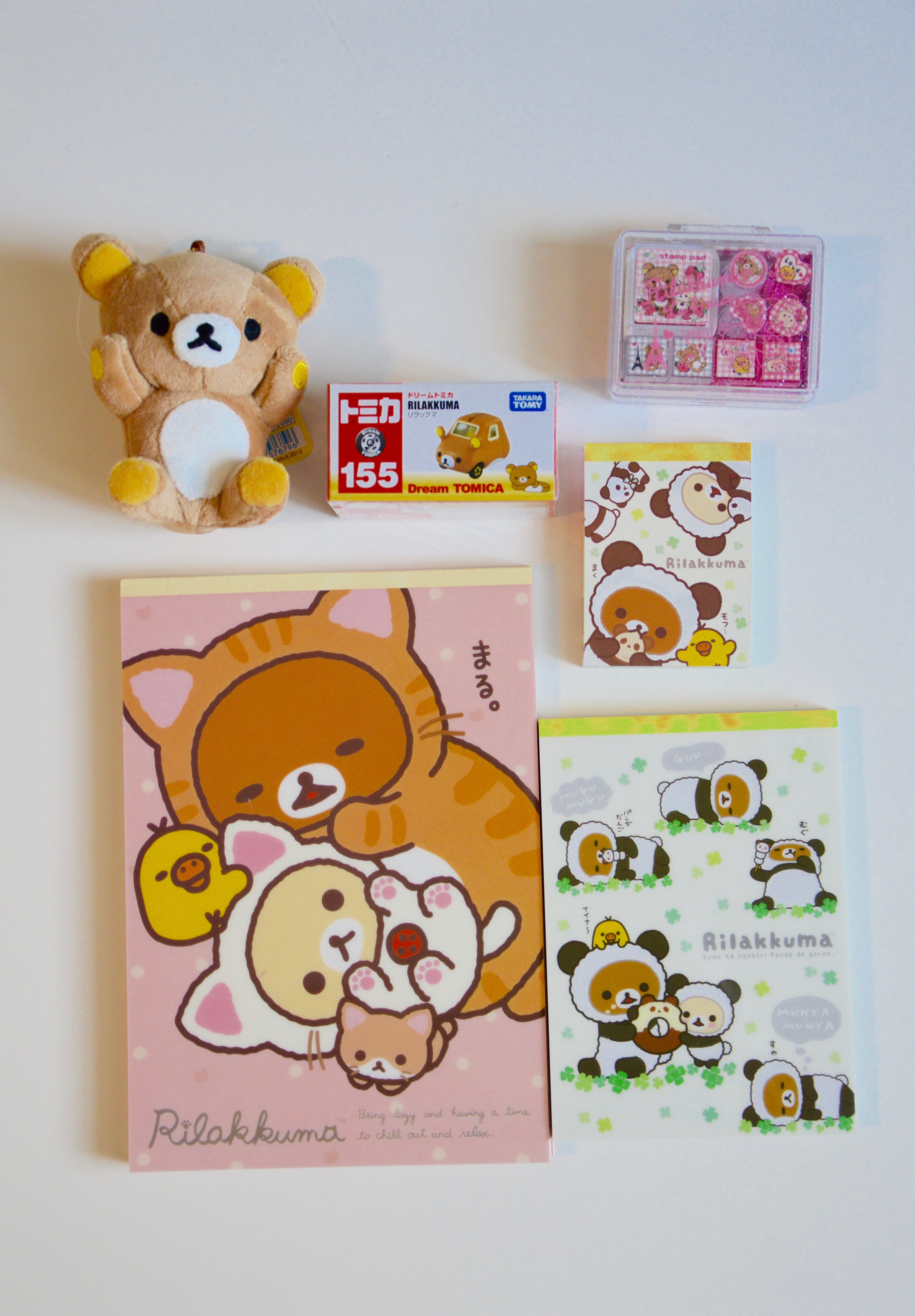 - Le gros lot : 3 blocs notes de tailles différentes, 1 petite peluche Rilakkuma, 1 petite voiture Rilakkuma, 1 boite de tampons. (image ci-dessous)