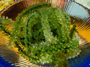 – de multiples algues à récolter au fil des saisons, comme les algues mozuku (dont la pleine saison est d’avril à juin) qui se dégustent par exemple en salade, ou les « raisins de la mer » dont les petits grains salés explosent en bouche
