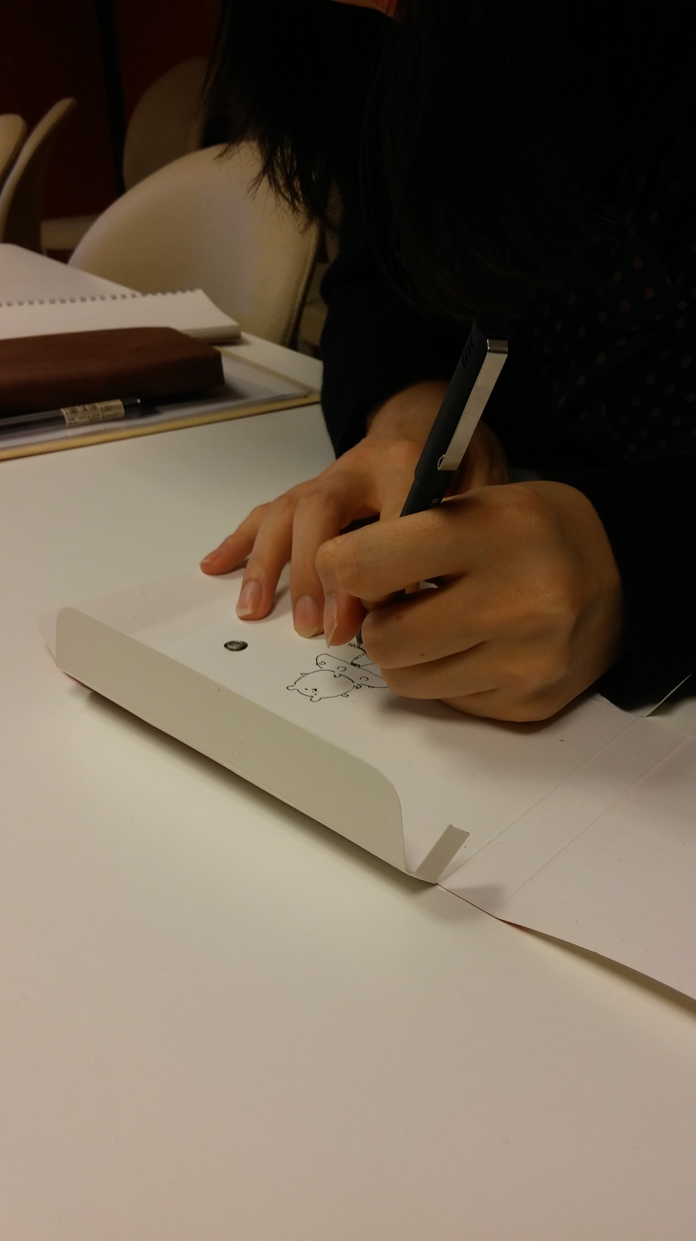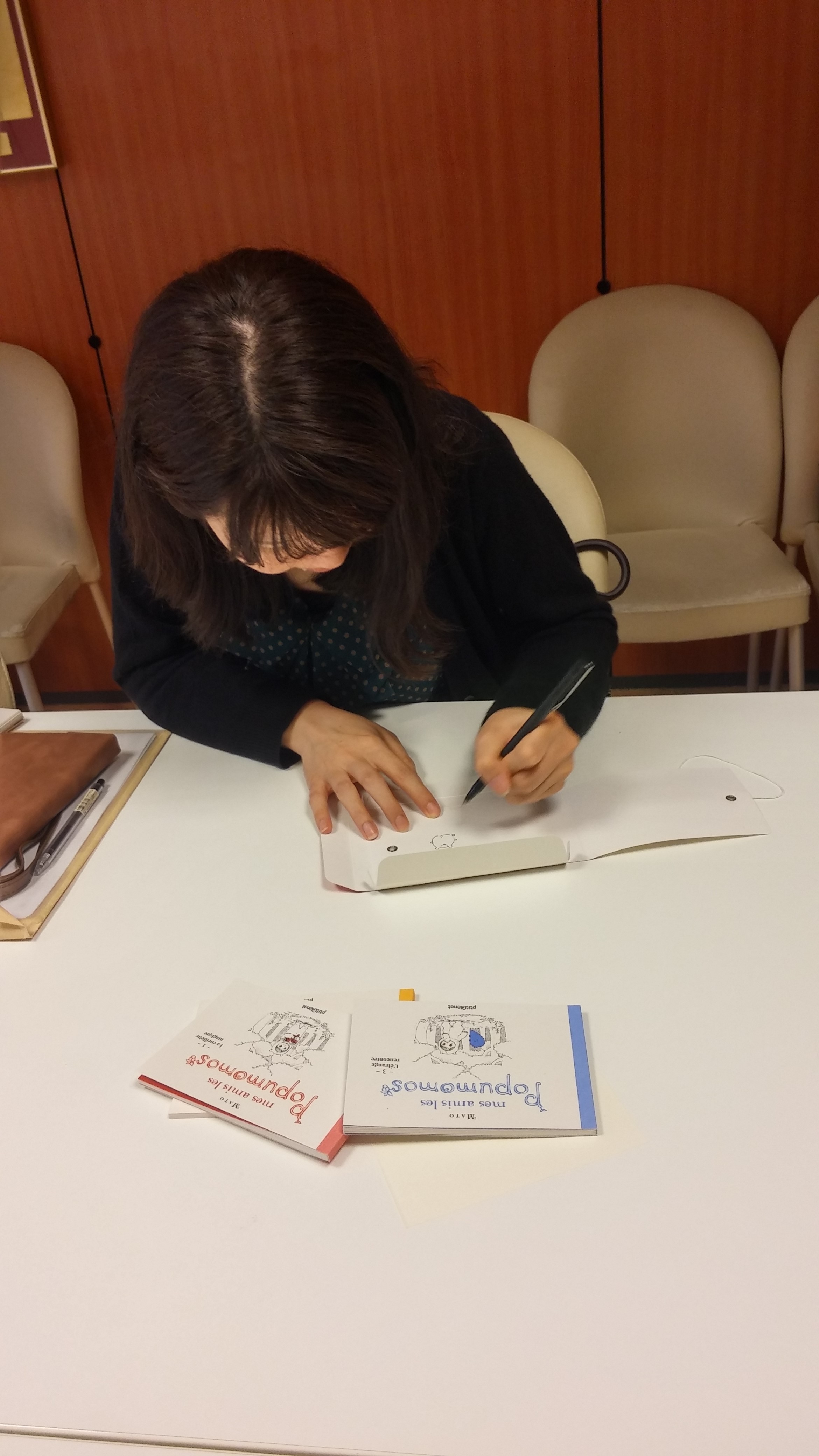 À la base j’ai créé les Popumomos pour les présenter dans un événement où tout le monde peut venir proposer soit-même ses ouvrages. Une sorte de grande vitrine où des professionnels viennent y repérer des titres intéressants ou même des choses originales. À ce moment-là, j’avais en fait deux choix qui s’offraient à moi : soit je continuais moi-même à faire des choses qui m’intéressaient et me plaisaient énormément, soit je m’adaptais au schéma professionnel japonais. C’est quand je me posais cette question que Glénat m’a contactée. Et parmi toutes mes productions, ils ont décidé de publier Mes amis les popumomos. Comme j’ai toujours rêvé de voir un jour mes livres publiés et présents en librairie, j’ai accepté. En terme de fabrication, j’ai laissé faire mon éditeur en toute confiance et toutes les propositions que j’ai reçues de sa part m’ont toujours très agréablement surprise et enthousiasmée. Dès qu’une proposition était faite, c’était le cas, donc je pense avoir eu raison de leur faire confiance.