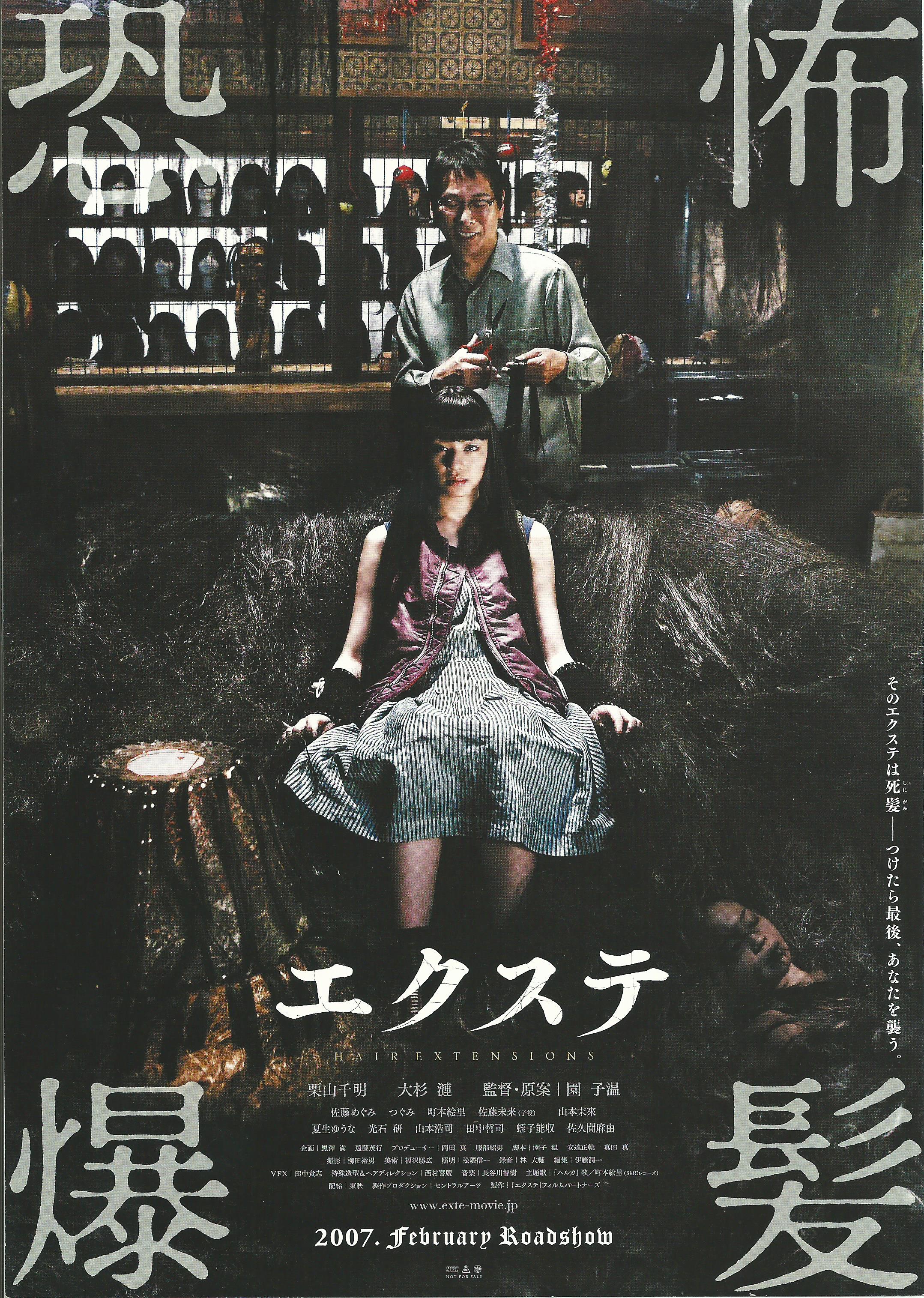 Petit résumé : la douane découvre le corps mutilé d’une jeune femme dans un container. Caché au milieu d’une nuée de cheveux qui ont même colonisé l’intérieur du cadavre, la personne en question semble avoir subi l’horreur d’un trafic d’organe alors qu’elle était encore vivante. Un employé de la morgue, fétichiste capillaire (incarné par Ren OSUGI) dérobe le cadavre lorsqu’il se rend compte que les cheveux en questions continuent de pousser, comme animés d’un irrépressible désir de vengeance. Il va alors commencer à les distribuer comme extensions capillaires dans les salons environnants. C’est justement dans un de ces salons (du nom de Gilles De Rais !) que Yûko (Chiaki KURIYAMA, alors en pleine hype post-Battle Royal et Kill Bill), une innocente jeune fille à la longue chevelure aussi parfaite que son cœur est pur, exerce sa profonde passion pour la capilliculture …