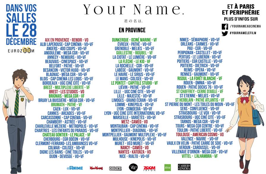 Pour terminer l’année en beauté, Journal du Japon s’associe à Eurozoom pour fêter la sortie du très attendu Your Name, le nouveau film de Makoto SHINKAI qui fait parler de lui depuis plusieurs mois désormais, et dont nous vous avons proposé une critique dans les colonnes de JDJ il y a peu… En attendant sa sortie le 28 décembre prochain, dix places de cinéma sont mises en jeu, du 24 décembre au 2 janvier, pour que vous puissiez découvrir ce long-métrage à ne pas rater !