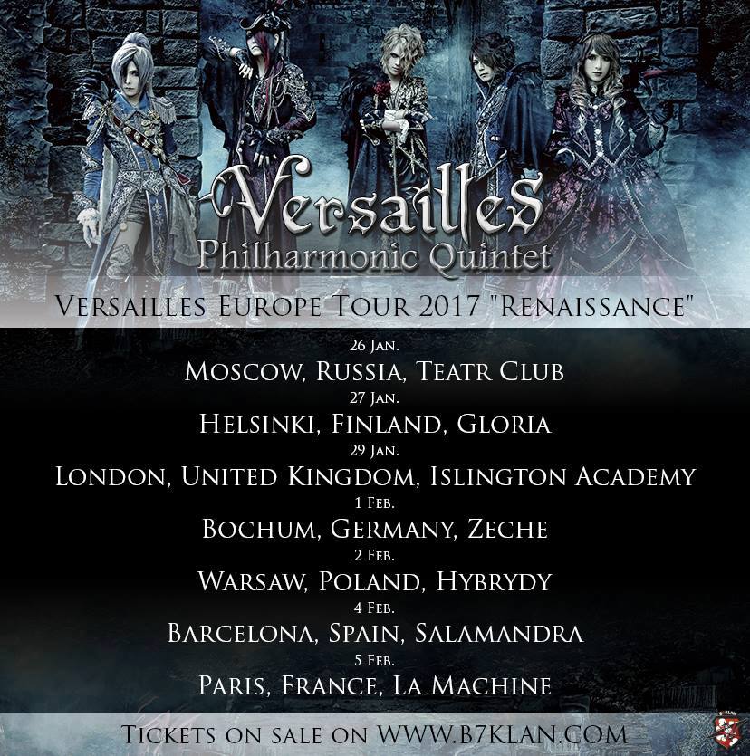Le groupe de visual kei Versailles Philharmonic Quintet est de retour après une longue pause. Le groupe, emmené par Kamijo (Lareine, etc.), fera une tournée en Europe en 2017 : Renaissance. Le concert aura lieu le dimanche 5 février à La Machine du Moulin rouge à Paris. Les billets sont en vente sur le site de B7klan.