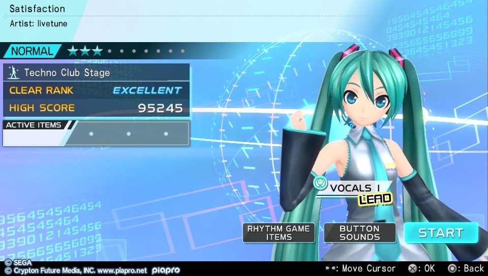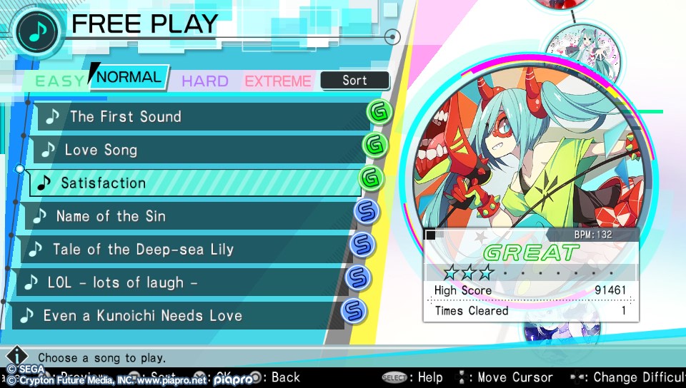 La setlist, puisque nous en sommes à parler du point principal du jeu, est composée de trente morceaux (Medleys compris) et s’avère assez complète et diversifiée. Classées d’abord par thème via les Clouds, leurs genres sont presque aussi nombreux qu’il y a de niveaux, et retrouver certains habitués de la série comme auteurs fera forcément plaisir aux connaisseurs… A moins qu’ils ne soient terrifiés d’avance en voyant ryo (Supercell), kz (livetune) ou encore Oster Project, qui leur rappelleront peut-être cette difficulté presque abusive que l’on pouvait trouver dans les épisodes PSP avec leurs mélodies (Qui a parlé de Marginal, World is Mine ou Kocchi Muite Baby ?)… Mais qu’ils se rassurant, leurs participations à cet épisode restent beaucoup plus accessibles. Quoi qu’il en soit, si l’on pouvait craindre une durée de vie réduite, il n’en est rien.