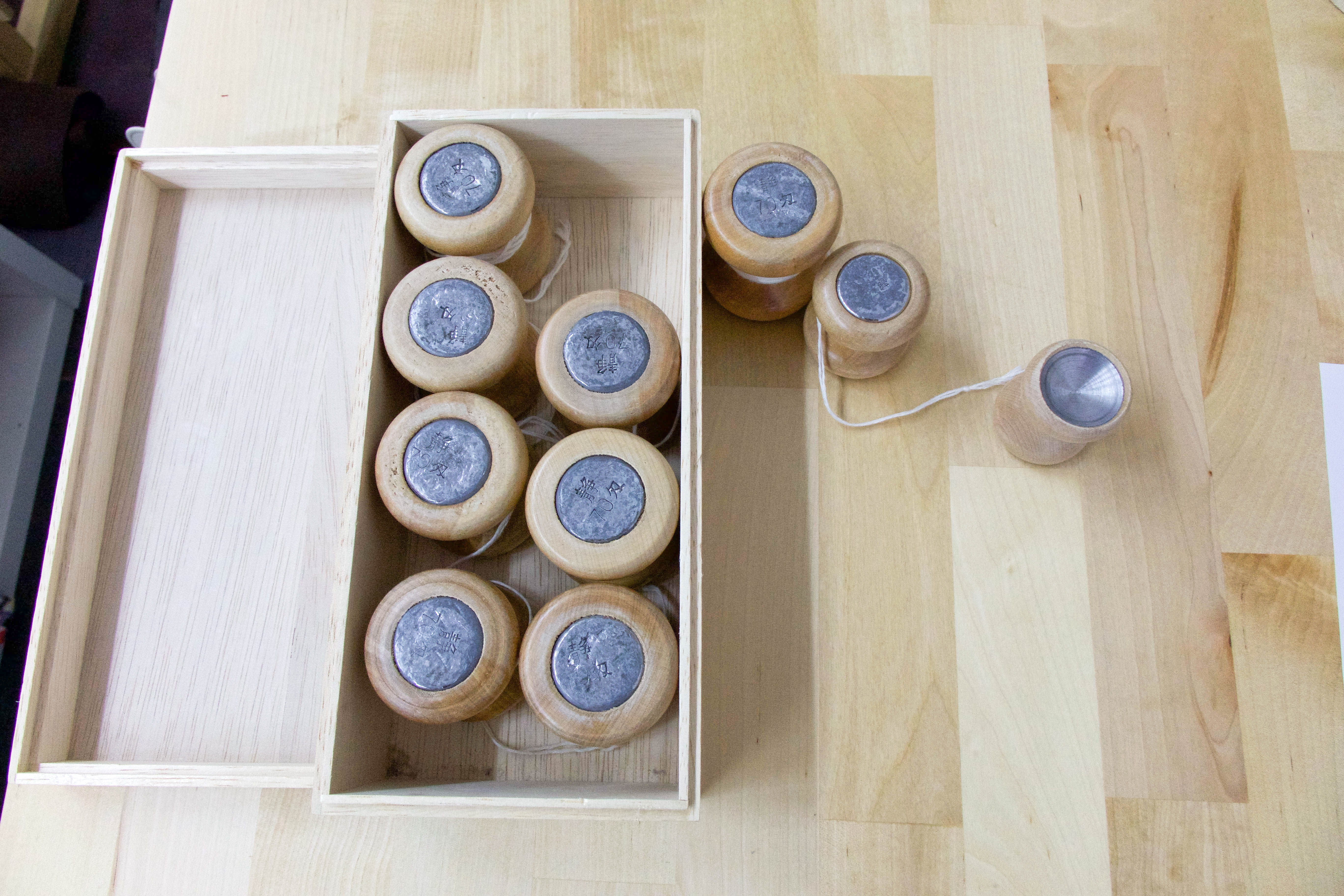 Il y a d’abord les tama (NDLR : ci-dessous, à droite), des contre-poids nécessaires lorsque l’on commence à tisser car les accessoires que l’on crée peuvent être longs et donc lourds. Il faut donc avoir un ensemble ni trop chargé, car cela risque de tirer sur les fils, ni trop léger car les fils ne seront pas assez soudés entre eux.