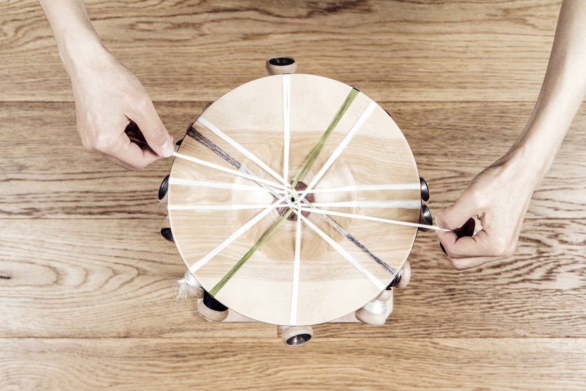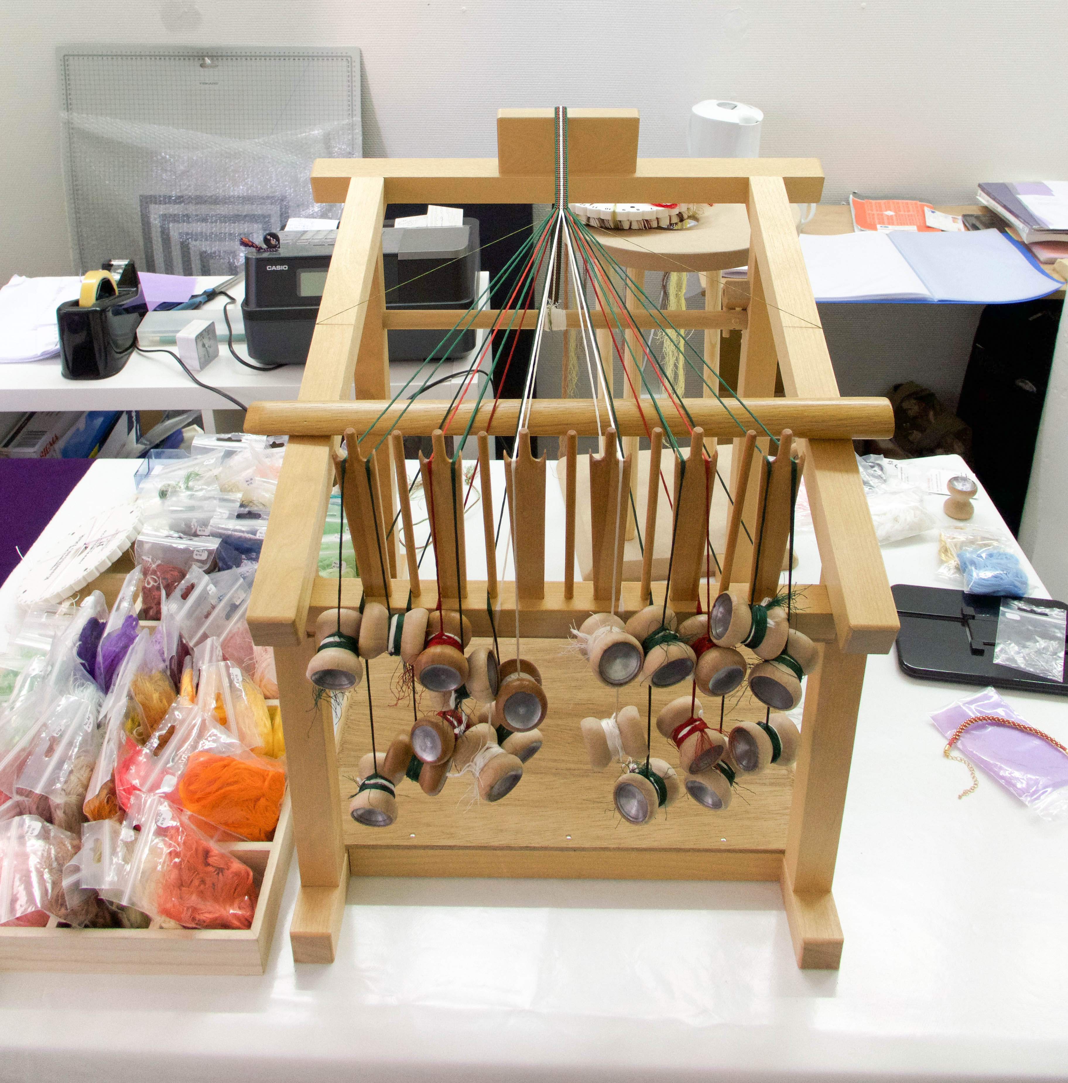 Ensuite, nous avons les ‘appareils’ déclinés en cinq versions. En boutique, je n’en dispose que de trois : Marudai, Ayatakedai (NDLR : ci-dessous, à gauche) et Takadai. Il s’agit des supports où sont déposés les fils et les poids. Chaque support permet de pratiquer différentes techniques pour obtenir de nouveaux types d’accessoires. Des modèles complexes peuvent nécessiter des heures de travail. Enfin les fils sont composés d’environ 42 brins. J’utilise de la soie mais d’autres types de fils sont envisageables.