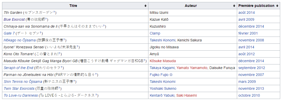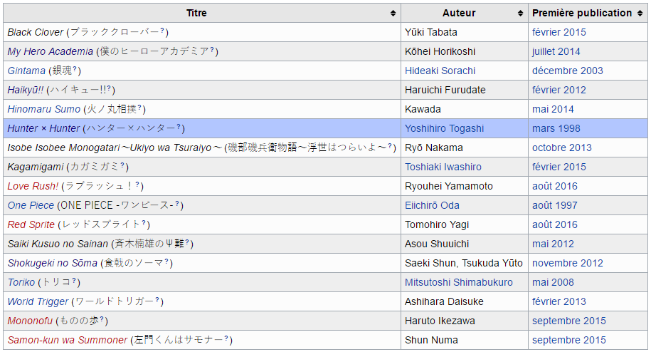 Les deux hommes arrivent aux éditions Shueisha au début des années 2000, mais devenir rédacteur en chef, même adjoint, ne se fait pas en un jour, surtout lorsqu’il s’agit du Weekly Shônen Jump. Il faut dire que celui qu’on appelle couramment le Shônen Jump, qui fêtera ses 50 ans l’an prochain, est le magazine de prépublication de manga le plus vendu au Japon, et donc au monde : jusqu’à 6.5 millions d’exemplaires par an à l’époque de son apogée dans les années 90, et toujours près de 3 millions chaque année aujourd’hui. Publié chaque lundi, l’ouvrage présente désormais une vingtaine de séries (seize en ce moment, voir image ci-dessous) dont la pérennité et la mise en avant dépend de leur popularité, mesurée par un bulletin de sondage présent dans le magazine.