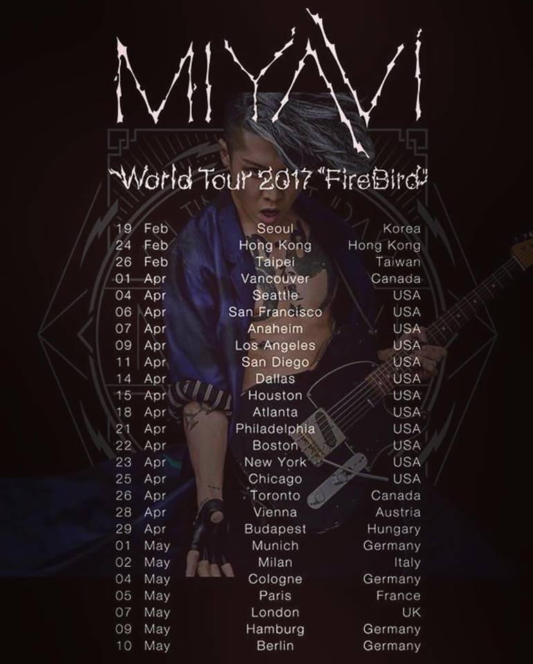 Le guitariste samouraï, Miyavi, est de retour en France pour présenter son nouvel album Fire bird (2016) et la sortie de son nouveau best-of All Time Best – Day 2 le 5 mai prochain chez Wrasse/Caroline Distribution qui fête ses 15 ans de carrière. L’artiste a déjà commencé une tournée en Asie et au printemps ce sera le tour des Etats-unis et de l’Europe. Pour ce qui nous intéresse il sera de retour à Paris sur une scène qu’il connait bien, le vendredi 5 mai à l’Elysée Montmartre. Les tickets sont en vente au prix de 30€ à la FNAC.