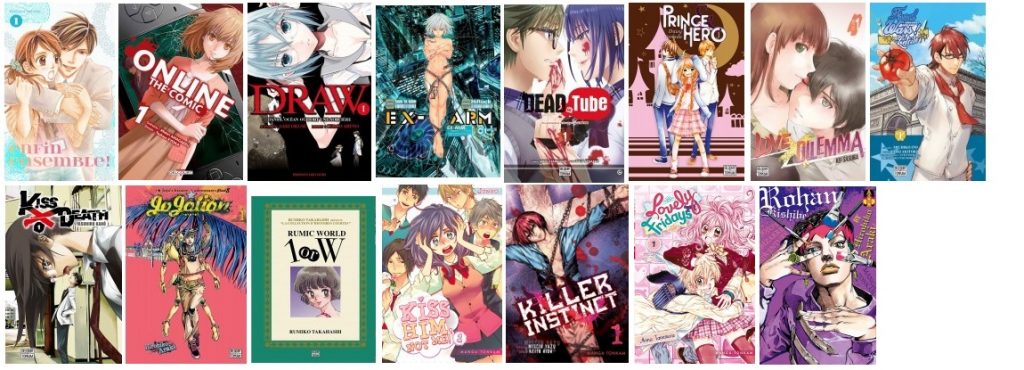 En parallèle, au niveau des nouveautés parues l’année dernière, on a donc pu découvrir 15 titres (Kiss him, not me, Killer instinct, Lovely fridays, Rohan Kishibe, Enfin ensemble!, Online – The Comic, Draw, EX-Arm, Dead Tube, Prince et Hero, Love X Dilemma, Food wars – L’Etoile, Kiss X Death, Jojolion et le one-shot Rumic World – 1 or W.), certains s’étant révélés très bons, tandis que d’autres n’apportaient clairement pas spécialement de plus-value à des thèmes déjà surreprésentés dans la production actuelle (romances pleines de clichés, séries B, survivals, etc).