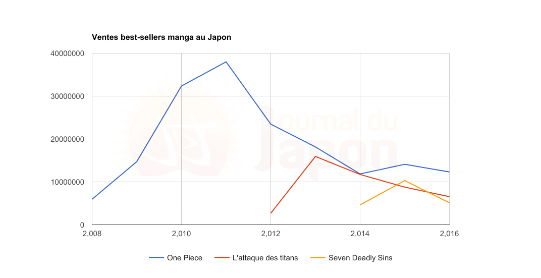Huit ans. Cela fait huit années que One Piece domine le classement des ventes par série établi par l’institut Oricon, institut de sondage nippon de référence. Ce succès amorcé en 2008 a battu tous les records historiques de vente au Japon, frôlant les 40 millions d’exemplaires écoulés en 2011, avant que le phénomène ne se dégonfle pour atterrir en douceur en 2014 autour des 12-13 millions d’exemplaires vendus chaque année. Un niveau qui n’en reste pas moins colossal car, même au Japon, rares sont les mangas qui ont approché la barre des 10 millions de tomes écoulés sur un an : seul L’attaque des Titans en 2013 et 2014 puis Seven Deadly Sins, de justesse en 2015, ont franchi ce cap. Il n’y a guerre que ces deux séries qui font office de sérieux challenger face au manga d’Eiichiro ODA, mais sans jamais lui ravir sa couronne. Le graphique ci-dessous, très parlant, replace d’ailleurs les succès des trois séries à leur échelle respective :