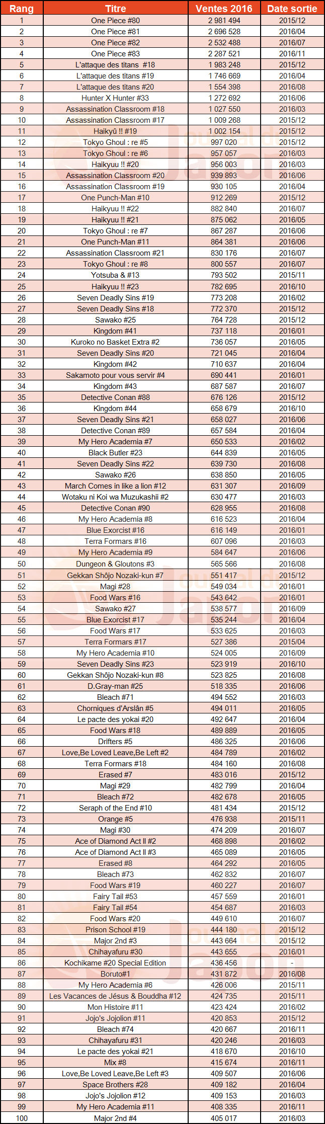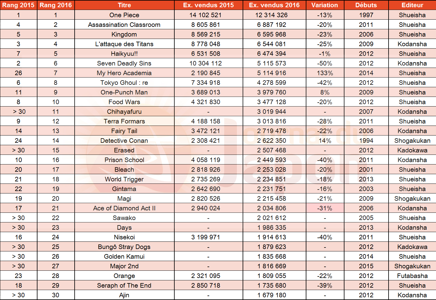 En 2016 il s’est vendu 12.3 millions d’exemplaires de One Piece, presque le double des 6.5 millions d’exemplaires pour L’attaque des Titans ou les 5.1 millions d’exemplaires de Seven Deadly Sins. En 2016, d’autres séries ont tenté de challenger Luffy et ses amis sur le marché nippon. Mais l’écart reste notable, comme le montre le Top 30 des ventes globales selon l’Oricon, établi du 23 novembre 2015 au 20 novembre 2016 (cliquez sur l’image pour l’agrandir)