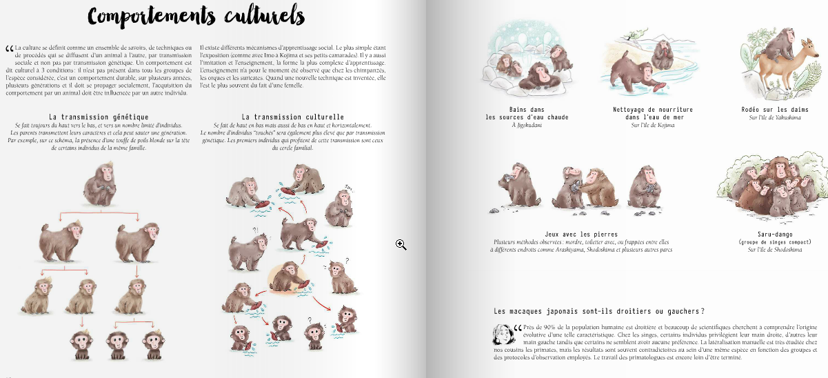 En plus des commentaires des primatologues au fil des pages, de grandes doubles pages illustrées par Delphine Vaufrey permettent d’expliquer différents aspects de la primatologie : Les macaques dans le monde, Comportements culturels (transmission sociale, pas génétique), Hiérarchie et vie sociale, Journée type (d’un macaque japonais), L’expérience de Charles Menzel (un singe fait le rapprochement entre un fruit qu’on lui apporte et qu’il mange et l’arbre sur lequel pousse ce fruit et qui doit donc être en période de fructification), Mimiques faciales et vocalises (pour comprendre à quoi correspondent les cris entendus et les têtes que font les singes).