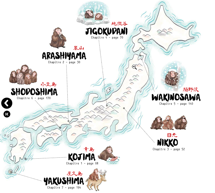 A Jigokudani, dans la préfecture de Nagano se trouvent les fameux singes des sources chaudes. Dans les années 60, les macaques sont descendus des montagnes, « chassés » par la construction de stations de ski. Ils ont alors voulu imiter les humains en se baignant dans les onsen, mais la cohabitation n’étant pas possible (difficile pour les touristes de se baigner dans la même eau que les singes), on leur créa leur propre onsen. Les touristes peuvent ainsi venir les photographier (et il faut voir dans le livre les photographies où quelques singes sont entourés de plusieurs dizaines de touristes !). Il est également possible de voir ces singes faire des boules de neige (ils ne les lancent pas mais s’amusent à manipuler la neige).