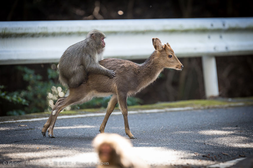 Le septième et dernier chapitre est consacré à Yakushima, une île au sud du Japon dont les amoureux de l’oeuvre de Miyzaki connaissent probablement le nom. C’est en effet ses forêts magnifiques qui ont inspiré le réalisateur pour les décors de Princesse Mononoke, et que nous présentions il y a peu à travers un album photo. Les singes sur cette île ont une allure différente : les poils tachetés, longs et fins comme des plumes leur donnent un visage différent, ils sont également plus petits. Comme dans le grand nord à Wakinosawa, ces singes n’ont jamais été nourris par l’homme. Ils trouvent sur l’île une nourriture variée et même des plantes pour leur automédication. Ils cohabitent également avec les cerfs sika. Les cerfs mangent les feuilles et fruits que les singes laissent tomber et les singes se servent des cerfs comme « moyen de transport ». C’est là qu’Alexandre a pu filmer une scène qui a fait le « buzz » sur les réseaux sociaux : un jeune singe en manque de femelle qui passe ses ardeurs sur une biche.