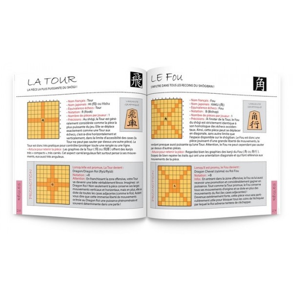 Les différentes pièces sont ensuite présentées : nom français et japonais, équivalence avec les échecs (quand elle existe), notation, nombre de pièces par joueur, précisions, astuce pour retenir la pièce (car ce sont des kanjis qui ornent les pièces du shôgi) et enfin promotion. Si le roi, le pion, le cavalier, la tour et le fou sont communs au shôgi et aux échecs, il existe de nouvelles pièces : général d’or, général d’argent et lance.