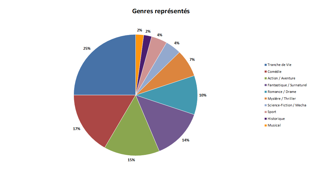En ce qui concerne les genres représentés, pas de changement puisqu’en tête, nous retrouvons la tranche de vie, la comédie, l’action / aventure et des univers fantastiques. Toutefois, d’autres sont un peu plus représentés que d’habitude, à l’image de la romance / drame ou du duo mystère / thriller. Pour finir, nous avons également un peu de science-fiction, de sport, de musique et de thématiques historiques.
