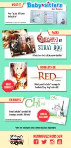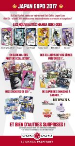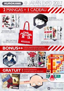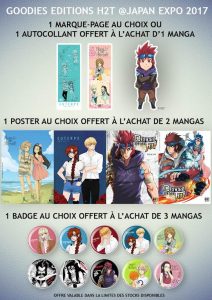 L’éditeur gâte ses lecteurs pour cette Japan Expo 2017 ! Vous pourrez repartir avec un tote bag, un sac kraft, un marque-page, un chèche, un masking tape, un poster, une bouteille d’eau, un bloc de post-it ou encore un sticker !