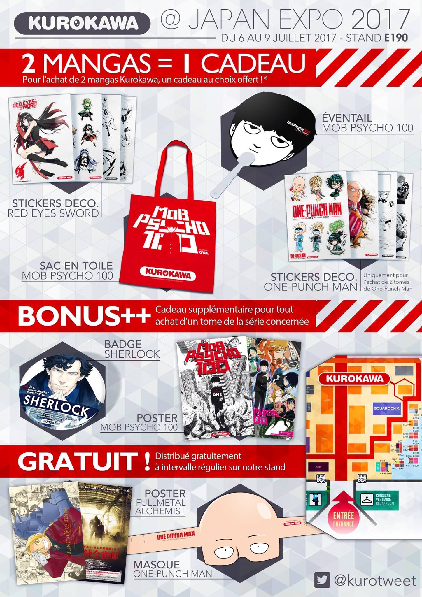 Vous pourrez aussi obtenir un tote bag ou un éventail Mob Psycho 100 ainsi que des planches de stickers Red Eyes Sword ou One-Punch Man. Enfin, en guise de cadeaux bonus repartez avec un badge Sherlock Holmes ou un poster géant Mob Psycho 100 !