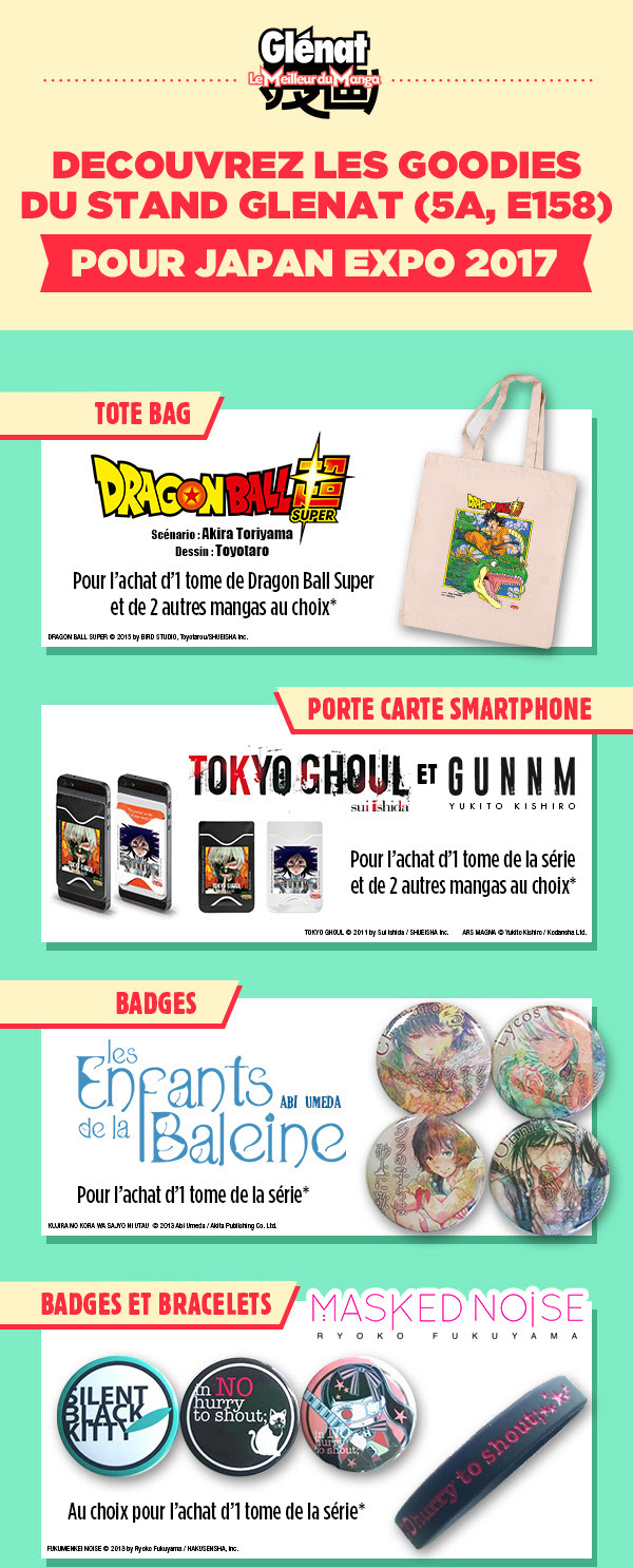 L’éditeur gâte ses lecteurs pour cette Japan Expo 2017 ! Vous pourrez repartir avec un tote bag, un sac kraft, un marque-page, un chèche, un masking tape, un poster, une bouteille d’eau, un bloc de post-it ou encore un sticker !