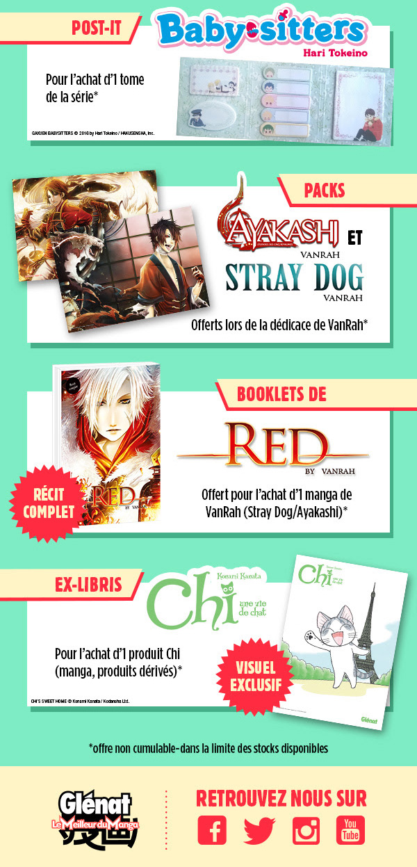 L’éditeur vous proposera de repartir avec des posters collector, des ex-libris, des stickers pour carte bleu. Tentez également de remporter des shikishi !