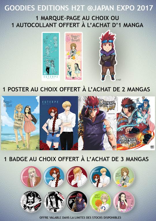 Vous pouvez ainsi repartir avec un autocollant, des marque-pages, des posters ou des badges à l’effigie de trois de leurs séries : Hana no Breath, Euterpe et D’Encre et de Feu, dont les auteurs seront présents sur le salon.