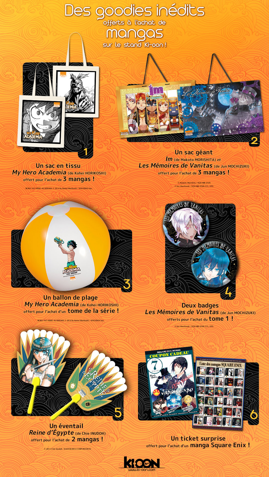 Pour les célébrer, repartez avec un sac en tissu MHA ou un sac géant comme seul l’éditeur a le secret depuis plusieurs années, un ballon de plage, un badge ou un éventail ! Et comme chaque Japan Expo depuis quelques temps, repartez avec un ticket Square Enix donnant accès à un goodies supplémentaire chaque jour à condition d’acheter un produit Square Enix.