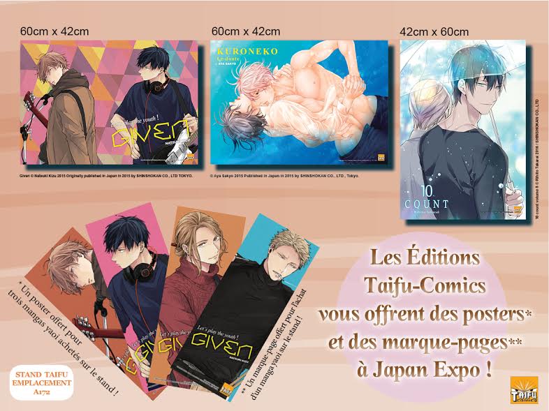 Retrouvez aussi ces séries avec les goodies sous forme de poster avec DanMachi et Sword Art Online. En partenariat avec Crunchyroll repartez avec une carte postale à l’effigie de Alderamin on the sky. Côté Taïfu Comics, ce sera des marques-page et des posters avec Given, 10 Count et Kuroneko !