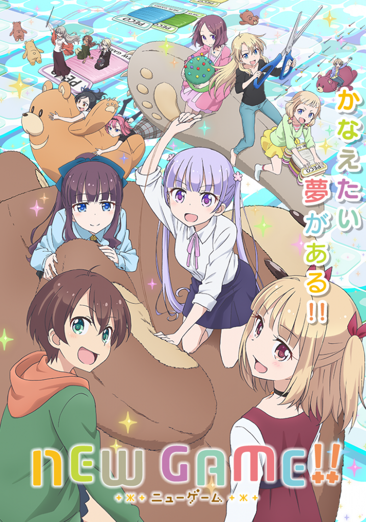 Série idéale pour se mettre de bonne humeur, avec un humour omniprésent et souvent ravageur, New Game! s’offre en plus quelques instants d’émotions. Ses personnages aux designs terriblement mignons et très attachants conquièrent rapidement le cœur du spectateur. Et l’évolution que leur offre alors la seconde saison est d’autant plus appréciable. Le travail proposé par Doga Kobo est encore une fois d’excellente qualité, faisant de la série l’une des plus juste techniquement cette saison. Avec en bonus des opening et ending bourré de joie, chantés par le groupe Fourfolium composé des seiyuus d’Aoba, Hifumi, Yun et Hajime, le chemin du bonheur c’est bien New Game! !