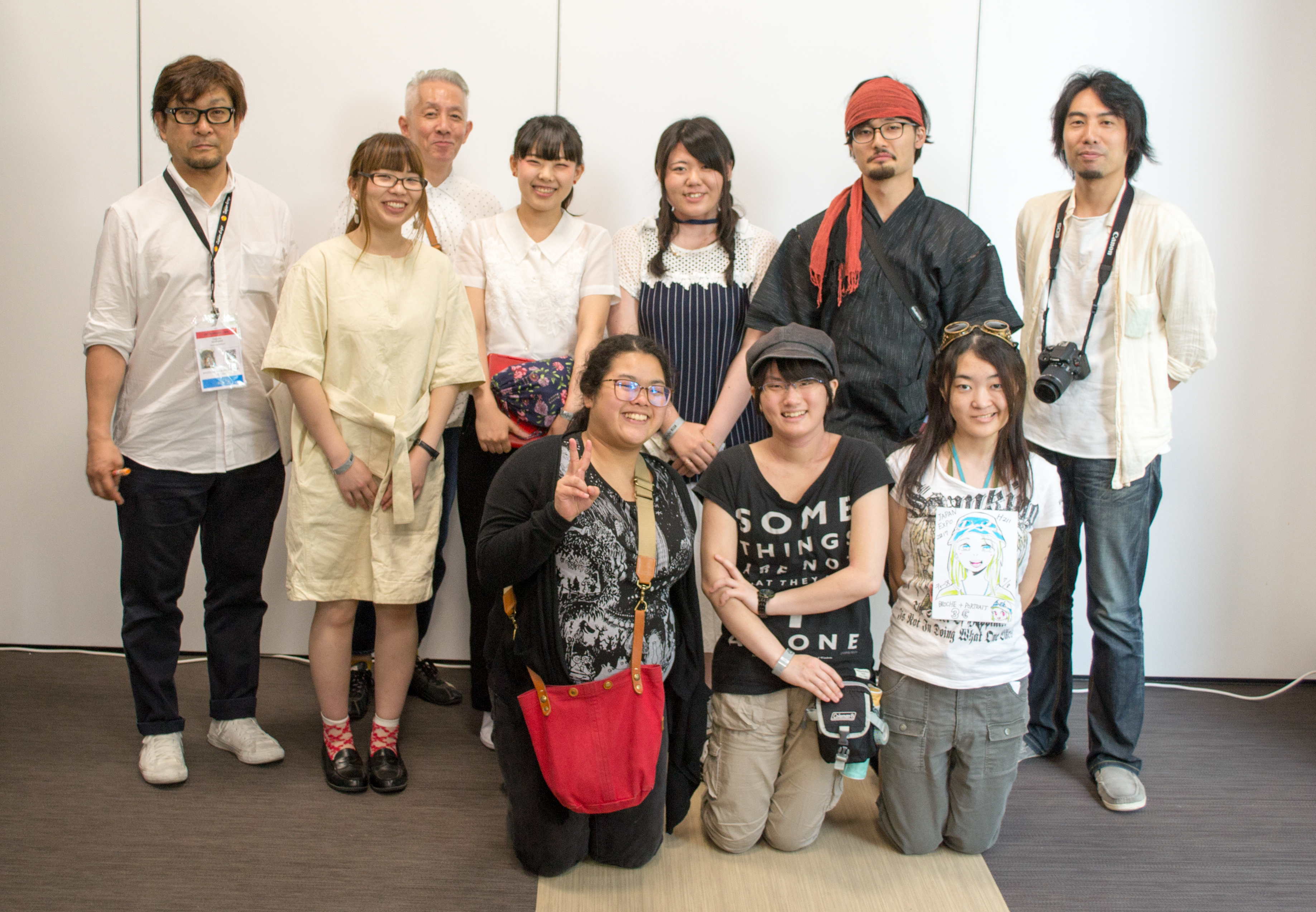 Nous sommes (de la droite vers la gauche sur la photo, NDLR) un garçon : Jojima Koki (production/organisation), et six filles : Arayama (production/organisation), Karakasa Miria (animation), Ayana Kato (illustrations, graphismes), Honda Mako (graphismes), Mimo Kaneko (animation de jeux vidéos et dessins), Kiyomi Kurihara (production). Du côté des professeurs : Ishinabe Daisuke (production/organisation), Ikeda Atsushi (CG 3D, qui n’avait pas d’élèves ce jour-là), Nomura Seiji (animation).