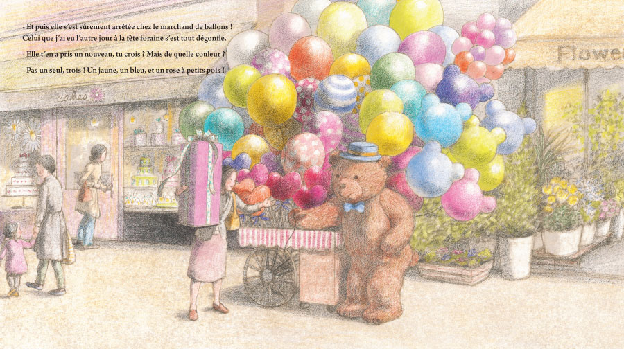 Peut-être que son train a encore eu un problème car c’est déjà arrivé il y a longtemps. Mais pas de problème, un éléphant, un hippopotame et d’autres animaux très costauds l’auront sûrement poussé jusqu’à la gare ! Et ensuite maman est peut-être passée prendre un gros gâteau qu’elle a eu du mal à choisir et à transporter car il est énorme. Et puis, elle a peut-être pris des ballons chez le marchand de ballons qui est un gros ours en peluche ! Peut-être même qu’elle s’est envolée et que les oiseaux l’ont guidée pour qu’elle arrive à l’école.
