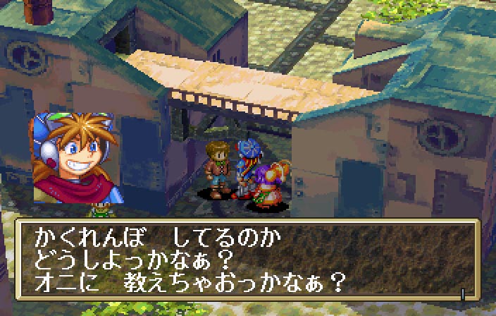 Les villes visitées ont toutes un charme particulier. Que ce soit Gambo, la ville en bord de mer, Zil Padon la cité regroupant trois ethnies différentes séparées en quartiers ou encore Laine, le village enneigé, toutes offrent un plaisir de les explorer certain (même si le fait de devoir tourner la caméra en permanence pour trouver les entrées des bâtiments, qui ne sont pas toujours du même coté, rend parfois difficile le repérage). Toutes, ainsi que les donjons traversés, feront avancer l’histoire, qui se suit avec plaisir. De rebondissements en moments touchants (voire carrément tristes par moments), elle remontera vers des notes plus légères et découvertes de nouveaux lieux toujours plus intéressants en permanence. En cela, Grandia donne vraiment l’impression de vivre un voyage, et pourrait presque faire retourner en enfance rêveuse, avec ces jeunes héros qui entament une quête qui va vite devenir épique, de la même façon que l’on rêve en regardant une série comme Fushigi no Umi no Nadia par exemple.