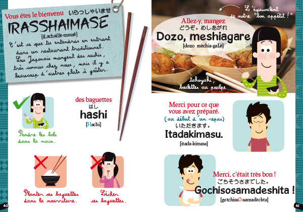 Richement illustré, présentant les éléments de base pour mener une conversation simple, ce guide présente chaque mot ou phrase en français, en japonais (hiragana) et en phonétique simplifiée pour en faciliter la lecture et prononcer correctement.