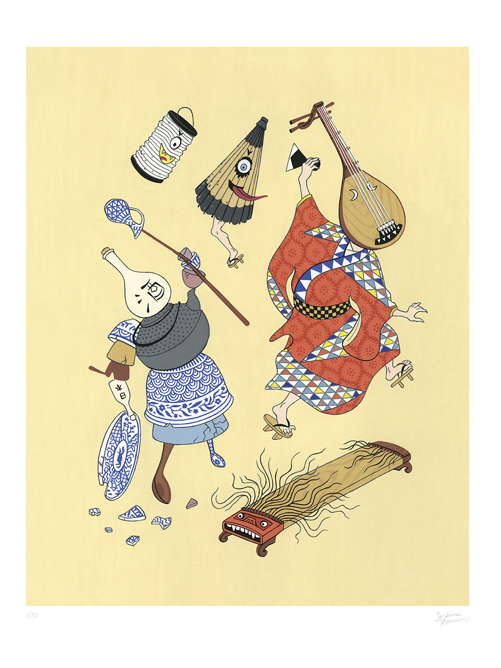 C’est l’univers classique japonais tout entier que j’aime particulièrement dessiner : la nature, l’architecture, les êtres humains ou animaux… Avec les dessins d’Hokusaï et de Kuniyoshi, et les bandes-dessinées de Shigeru Mizuki, je me suis aussi découvert un goût pour le côté étrange, grotesque et amusant de leurs créatures légendaires et imaginaires, très présentes dans la vie de tous les jours. C’est ce genre de bizarreries que j’ai eu le plaisir de dessiner dans mon dernier livre, Yôkai!, un documentaire écrit par Fleur Daugey et paru chez Actes Sud Junior en 2017.