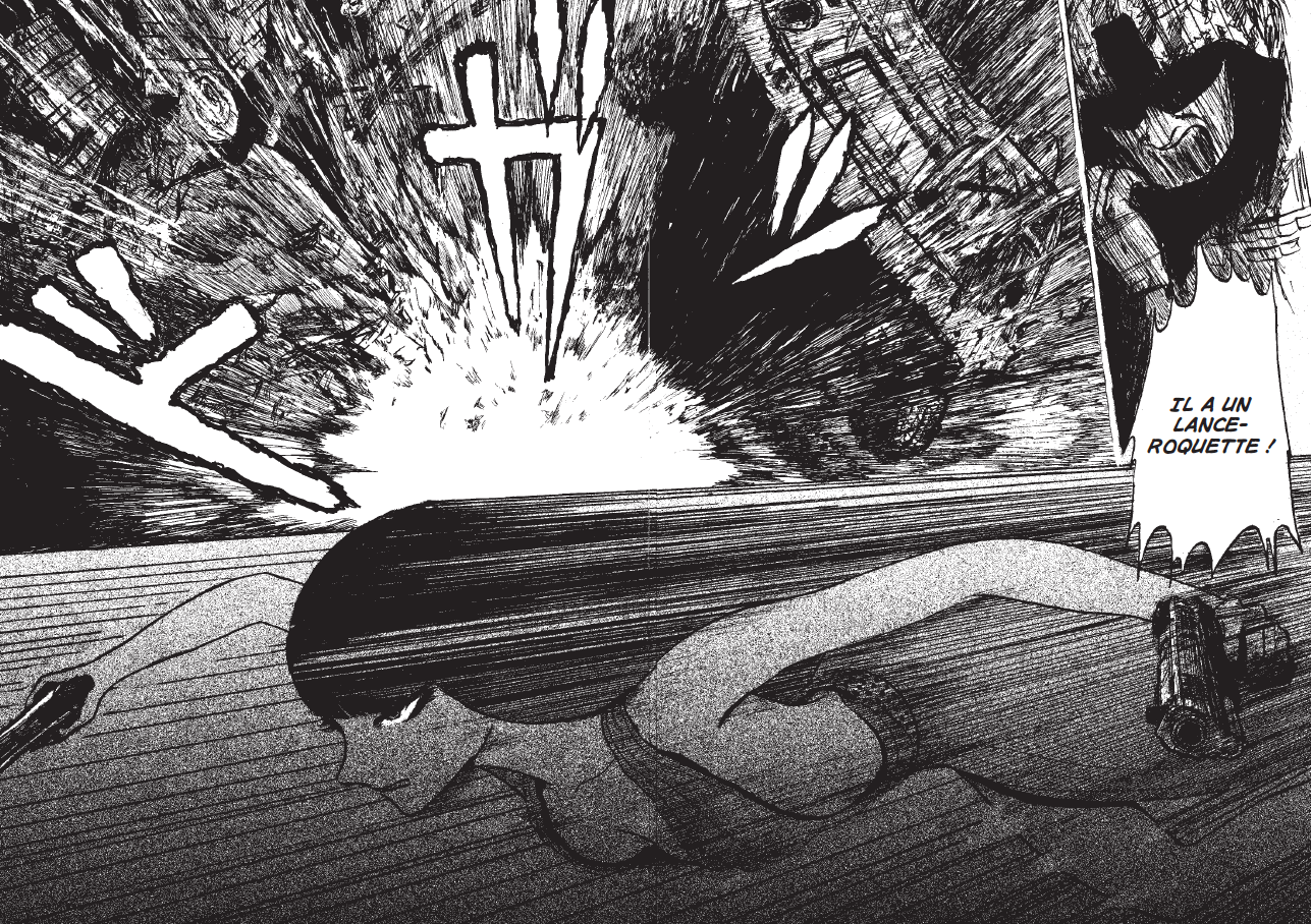 J’imagine la composition de la page ou de la double-page dans sa globalité. En fait, quand j’étais jeune j’ai eu des problèmes avec des petites frappes. Et si dans un manga classique, les différentes actions sont séparées par case – un coup, puis l’autre – la réalité est toute autre : quand 10 types déboulent en vous attaquant, rien n’est si clair, ça part dans tous les sens. C’est ce que je voulais retranscrire dans mes planches.