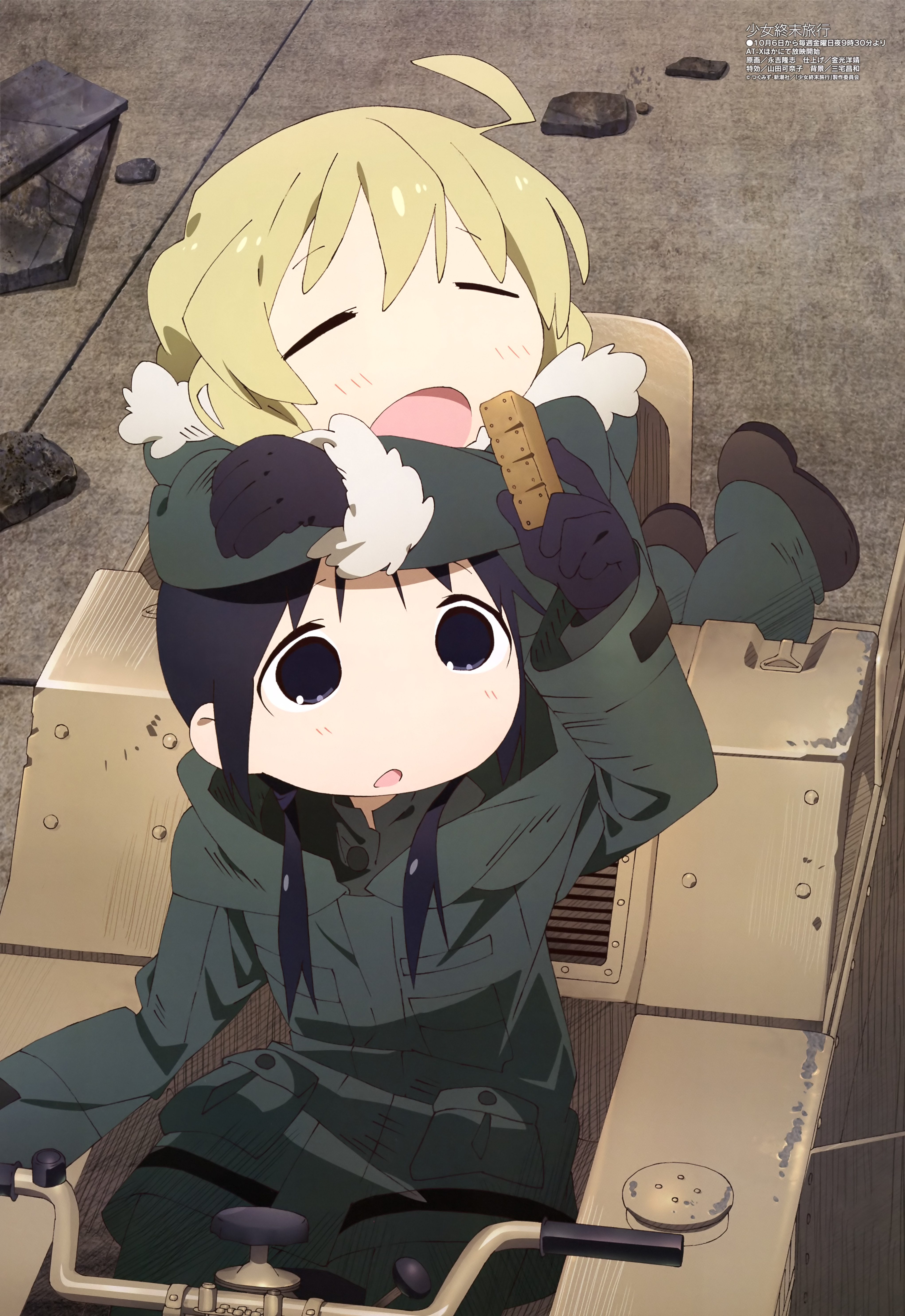Girls Last Tour est une série de douze épisodes de 24 minutes diffusée en fin d’année 2017 et disponible en France sur la plateforme Wakanim. C’est le studio White Fox qui fut en charge de la production de l’animation, ce qui présage du bon étant donné la qualité visuelle de la majorité de ses précédentes productions (Steins;Gate, Katanagatari, Gochuumon wa Usagi desu ka? ou plus récemment Re:Zero). Quant à son origine, il s’agit de l’adaptation d’un manga écrit et dessiné par Tsukumizu dans le magazine Kurage Bunch. Sa publication vient d’ailleurs de s’achever tout récemment, le 12 janvier 2018 pour être exact, après 4 ans et un total de six volumes. Détail toujours intéressant, on notera que l’auteure du manga s’est personnellement impliquée dans la production de l’anime, dont elle a supervisé l’écriture, travaillant même à l’animation de l’ending. Pour les plus curieux, sachez qu’elle possède également un compte Twitter sur lequel elle partage régulièrement des illustrations, ainsi qu’un Tumblr sur lequel elle poste occasionnellement de courtes animations.