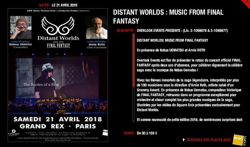 Distant Worlds: music from FINAL FANTASY revient à Paris, avec le compositeur Nobuo UEMATSU et le chef Arnie ROTH. Le 21 avril 2018 au Grand Rex de Paris, avec la nouveauté FINAL FANTASY XV au programme ! Le concert est organisé par OVERLOOK events.
